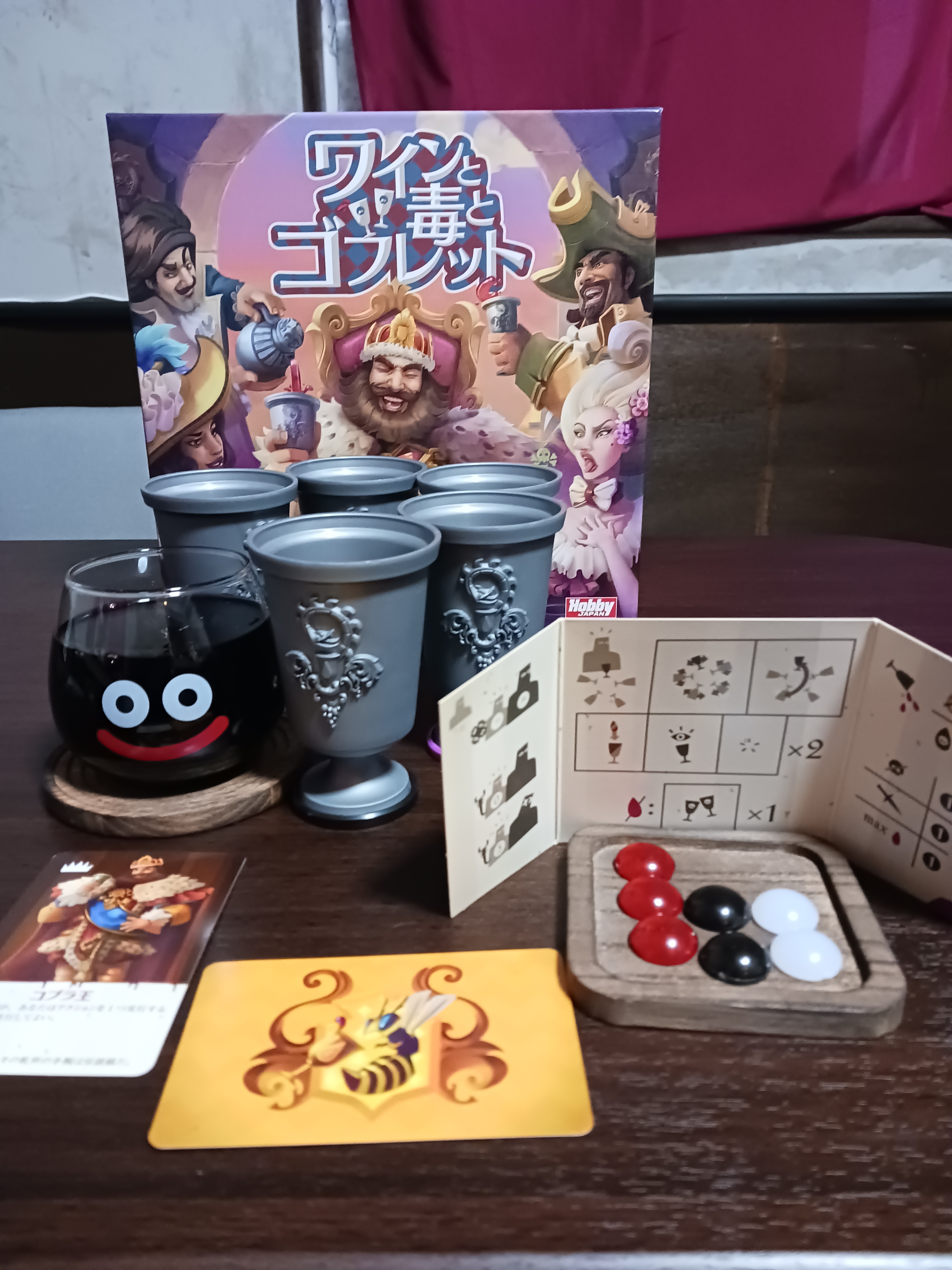 店主F(酒好き):あの、これ、実際にワインを飲む訳ではなくて、ワインや毒に模したトークンをゴブレット(グラス)に入れて、それを乾杯の合図と共に飲んで、標的を〇したり、自分が生き残る。それに応じた得点を得る。というゲームなんですよ。