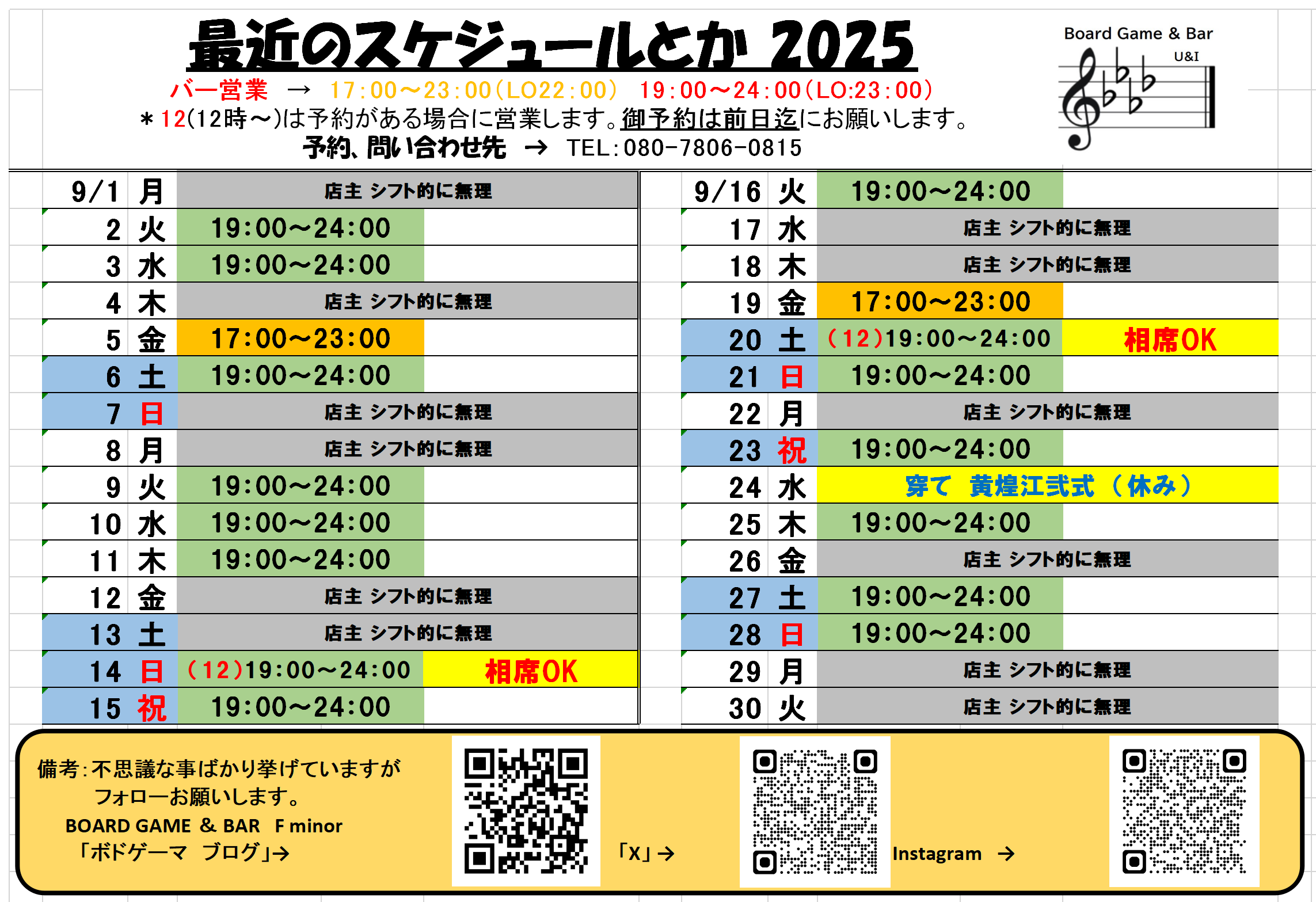 随分、ギリギリとなりましたが9月分のスケジュールとかです。暑さも落ち着きをみせ始める頃、夏はスタミナ切れで行えなかったイベント的な企画を始めていけたらいいな。と思います。あまり無理は致しません。手始めに「相席OK」という日、その日に合わせ、12時~オープン可能にしています。ただ、予約等が無いと12時オープンは致しませんので、悪しからず。