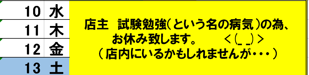 以下の期間お休みいたします。12/10~12/13です。この期間中も仕事をしながらの勉強となりますので、ご連絡の対応が遅くなる場合もあろうかと思います。