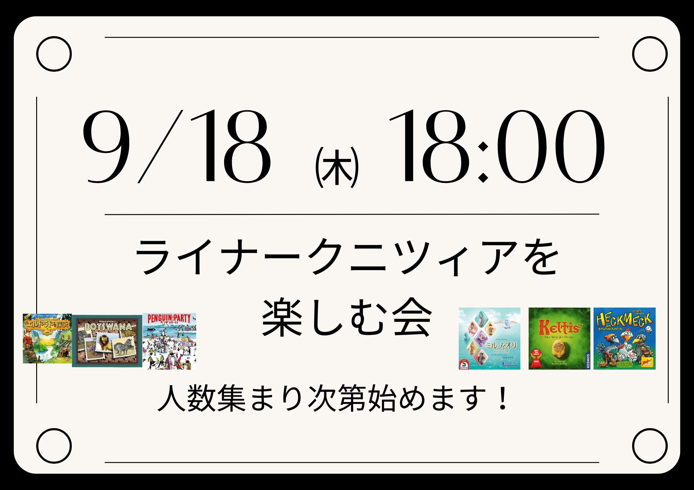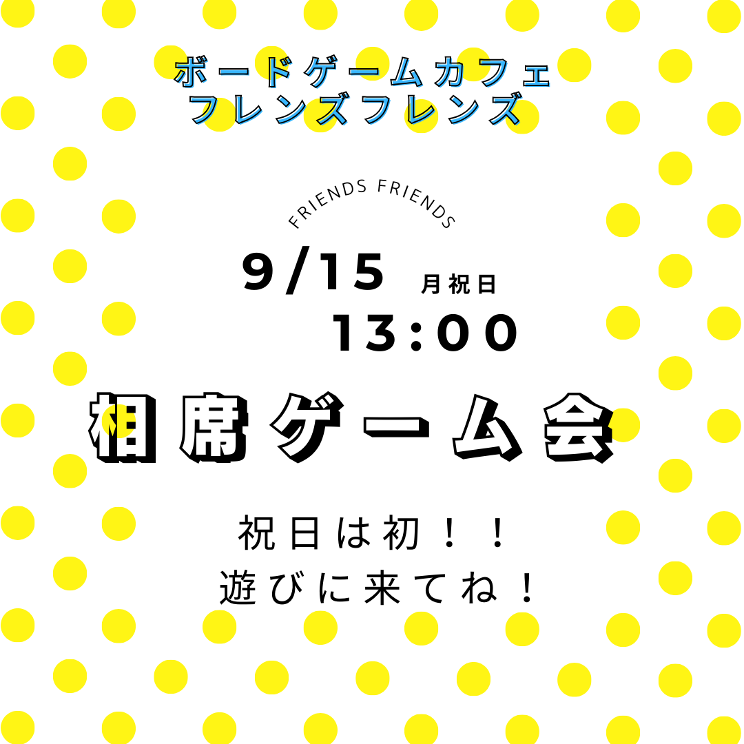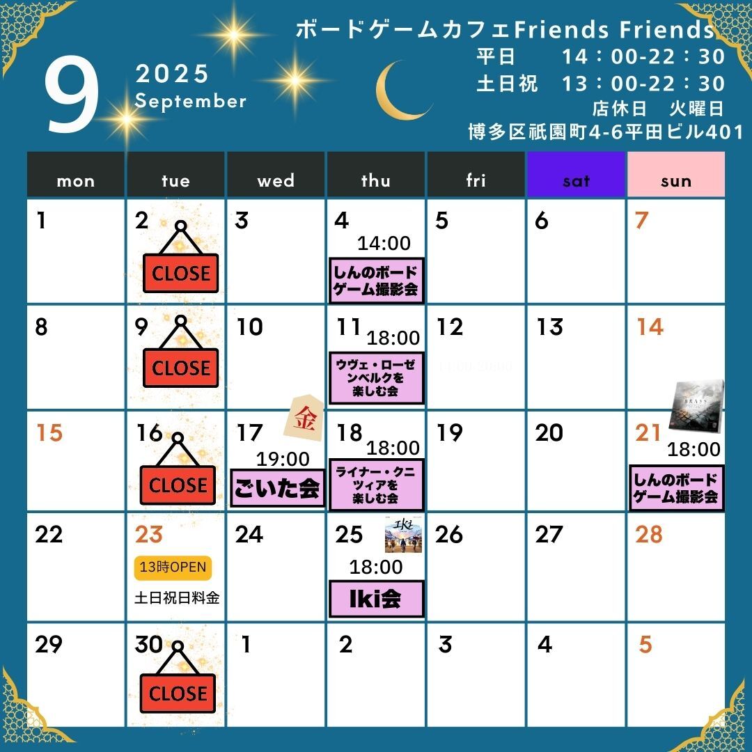 - 3ヶ月前2025年09月07日 22時14分頃9月のイベントスケジュール🍁福岡博多ボードゲームカフェフレンズフレンズです🎲☕️朝晩が少しずつ涼しくなってきましたね。今月も、ボードゲーム好きな皆さんに楽しんでいただけるイベントをたっぷりご用意しました。📌イベント一覧🔹相席ゲーム会9/3(火),5(金),12(金),19(金),26(金)|14:00〜おひとり様・初めて...26ページビュー