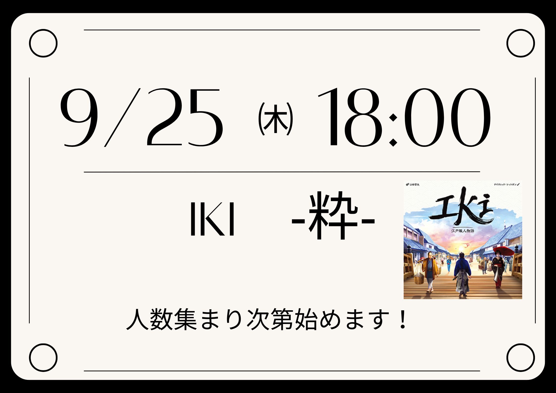 - 2ヶ月前2025年10月02日 03時31分頃10月イベント福岡博多ボードゲームカフェフレンズフレンズです!🍁10月のイベントスケジュール🍁今月もワクワクするイベント盛りだくさん✨📅イベント一覧👇🎴10/2(木)18:00〜Iki会江戸の街を体感!最も“粋”な江戸っ子を目指す人気ボドゲ✨ルール説明します。初めての方も大歓迎!時間:3時間程度📸10/9(...23ページビュー