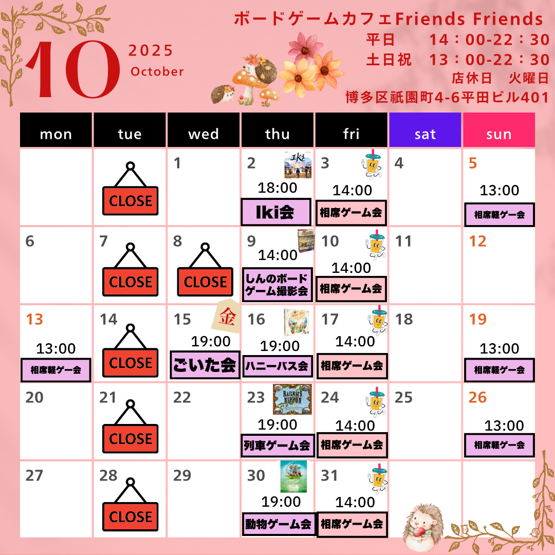 - 3ヶ月前2025年09月07日 22時14分頃9月のイベントスケジュール🍁福岡博多ボードゲームカフェフレンズフレンズです🎲☕️朝晩が少しずつ涼しくなってきましたね。今月も、ボードゲーム好きな皆さんに楽しんでいただけるイベントをたっぷりご用意しました。📌イベント一覧🔹相席ゲーム会9/3(火),5(金),12(金),19(金),26(金)|14:00〜おひとり様・初めて...26ページビュー