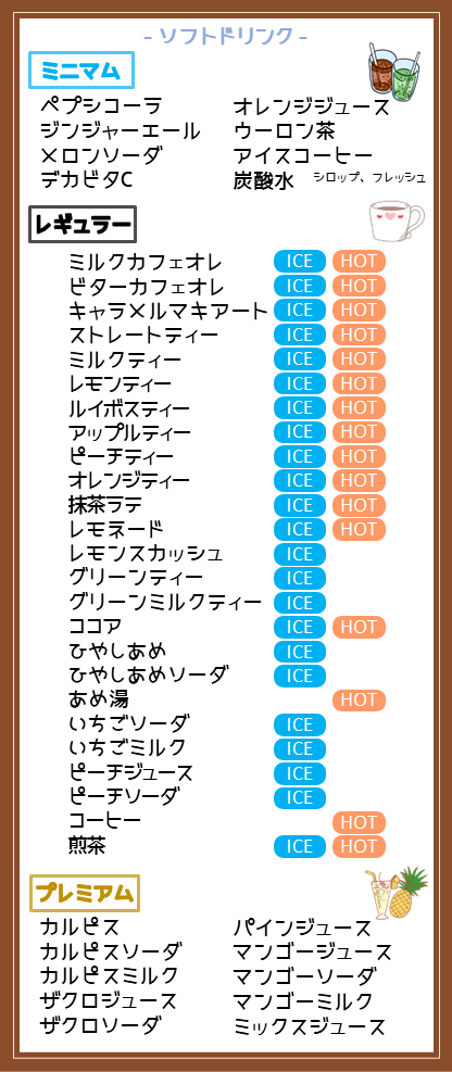 30分400円でソフトドリンク8種類が飲み放題!(ミニマムコース)
