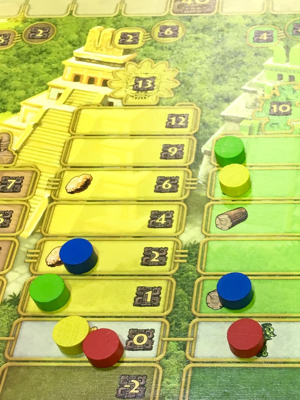 その1ゲーム中に3っつの神々(名前難しいので赤、黄、緑でOK)の神殿値を上げて信仰点を上げたり、資材で建物や記念碑などの建設で勝利点やゲームを有利にススメル恩恵を受けるものを獲得しながら勝利点を稼ぐ感じ