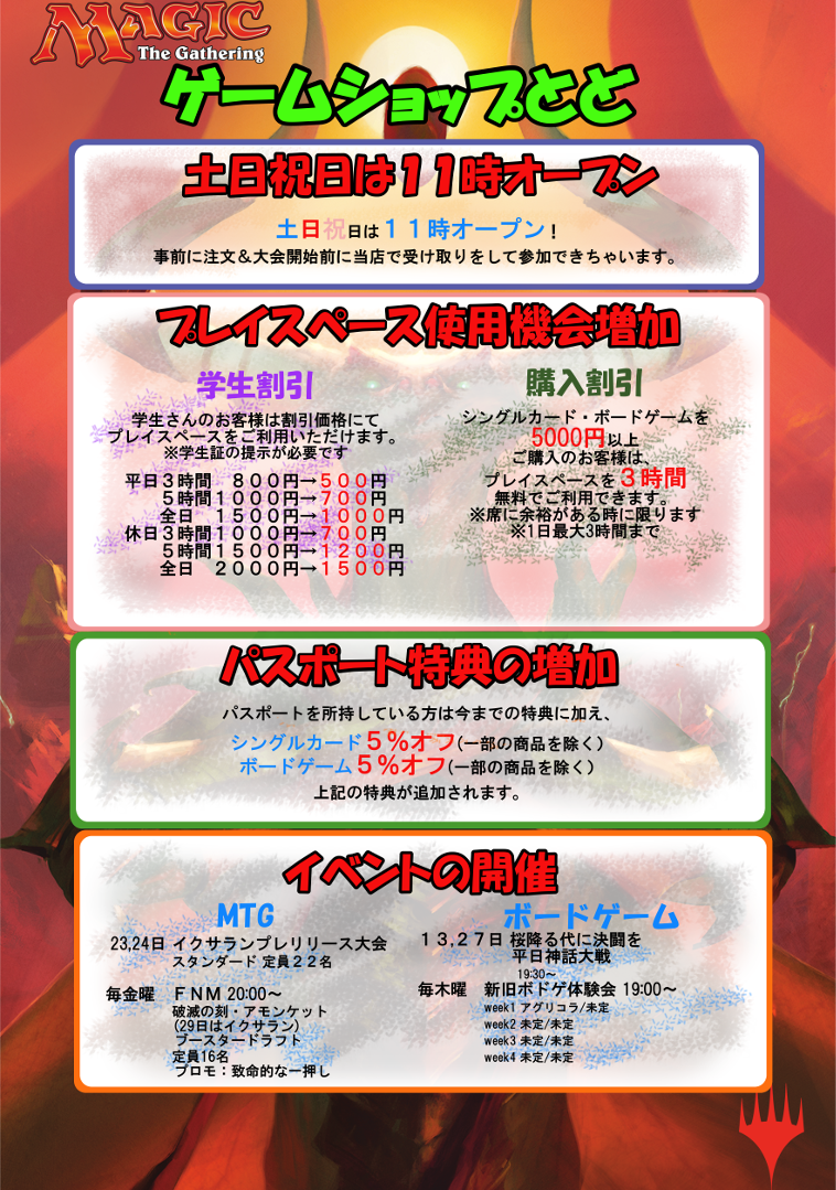 - 8年以上前2017年08月02日 15時08分頃8月テスト企画「土日祝日の営業時間延長」「プレイスペース学割&購入割」などこんにちわ、ゲームショップとど店長のとどちゃまです。開店より4ヶ月が経ち、多くの方にお越しいただき大変ありがたく思っております。当店では8月に営業施策のテストを行うため、いくつかの変更を行います。その1土日祝日の営業時間拡大その2プレイスペース利用料の学割・購入割・買取割(主にカードゲーム向け...75ページビュー