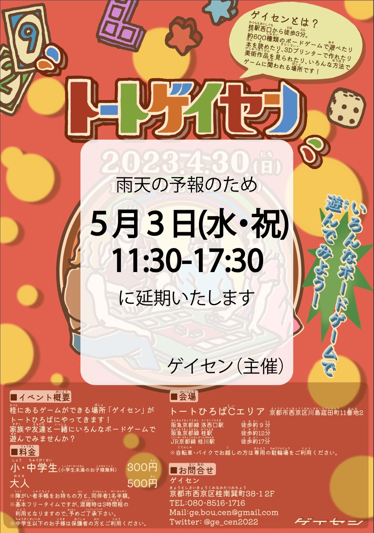 こちらのブログでは掲載していませんでしたが(詳しくはTwitterをご覧ください)、延期となってました出張ゲイセン「トートゲイセン」を5月3日(水・祝)に開催いたします。
