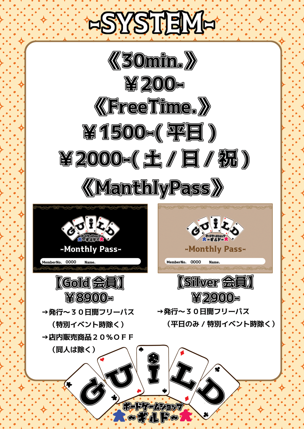 - 7年以上前2018年05月05日 20時02分頃【必見】ギルドからのお知らせ!こんにちは。いつもご来店や当店のページをご覧頂きありがとうございます(*´ω`*)ギルドからの耳よりなご案内です!実はこの度【5月1日】より…とってもお得な『マンスリーパス』ができました!パスの種類は2種類!【ゴールド会員PASS】→発行から30日間のフリーパス(特別イベント除く)…土日祝関係...230ページビュー