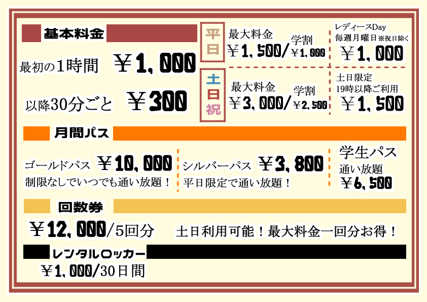 学生さんは学生証の提示でフリータイム¥500-OFF!