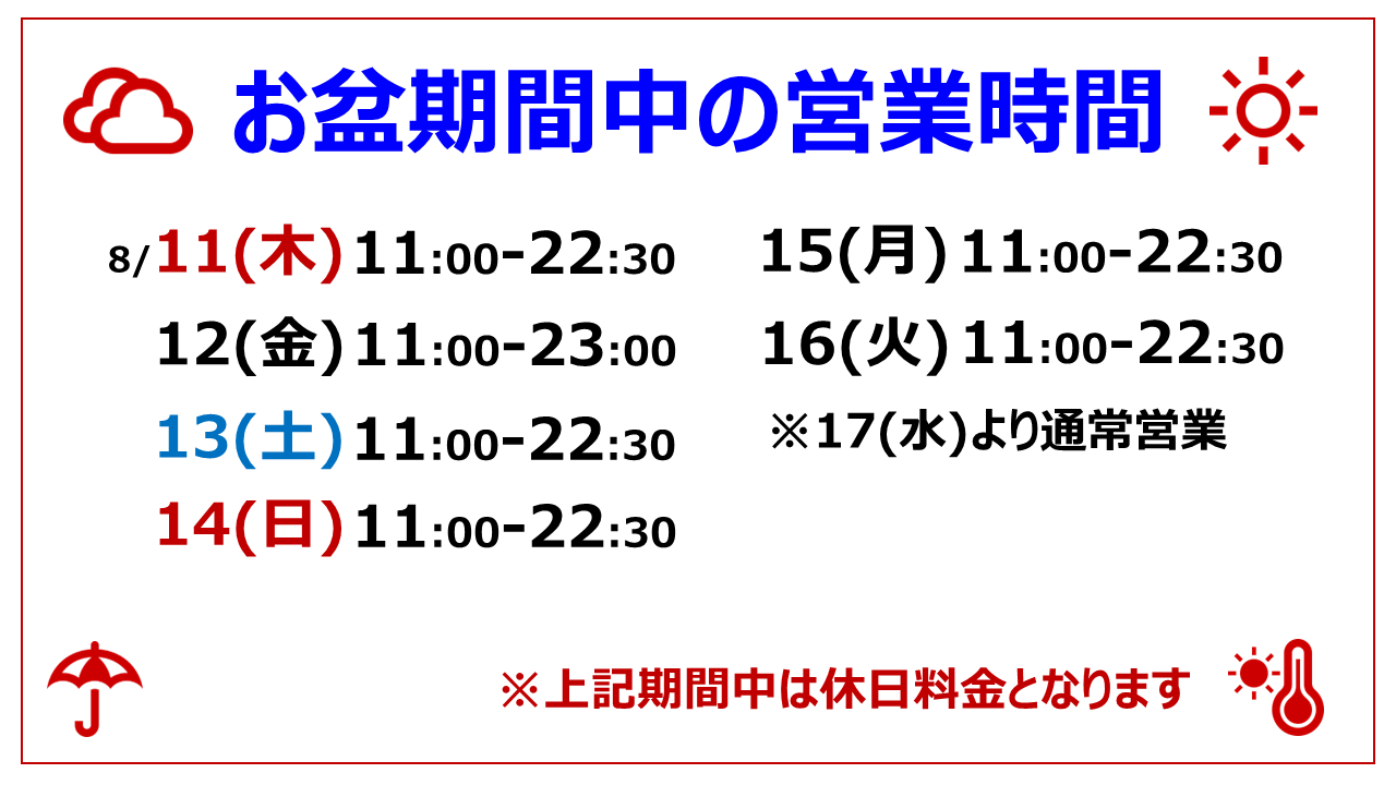 遅くなりましたがお盆期間中の営業日時のご案内です。