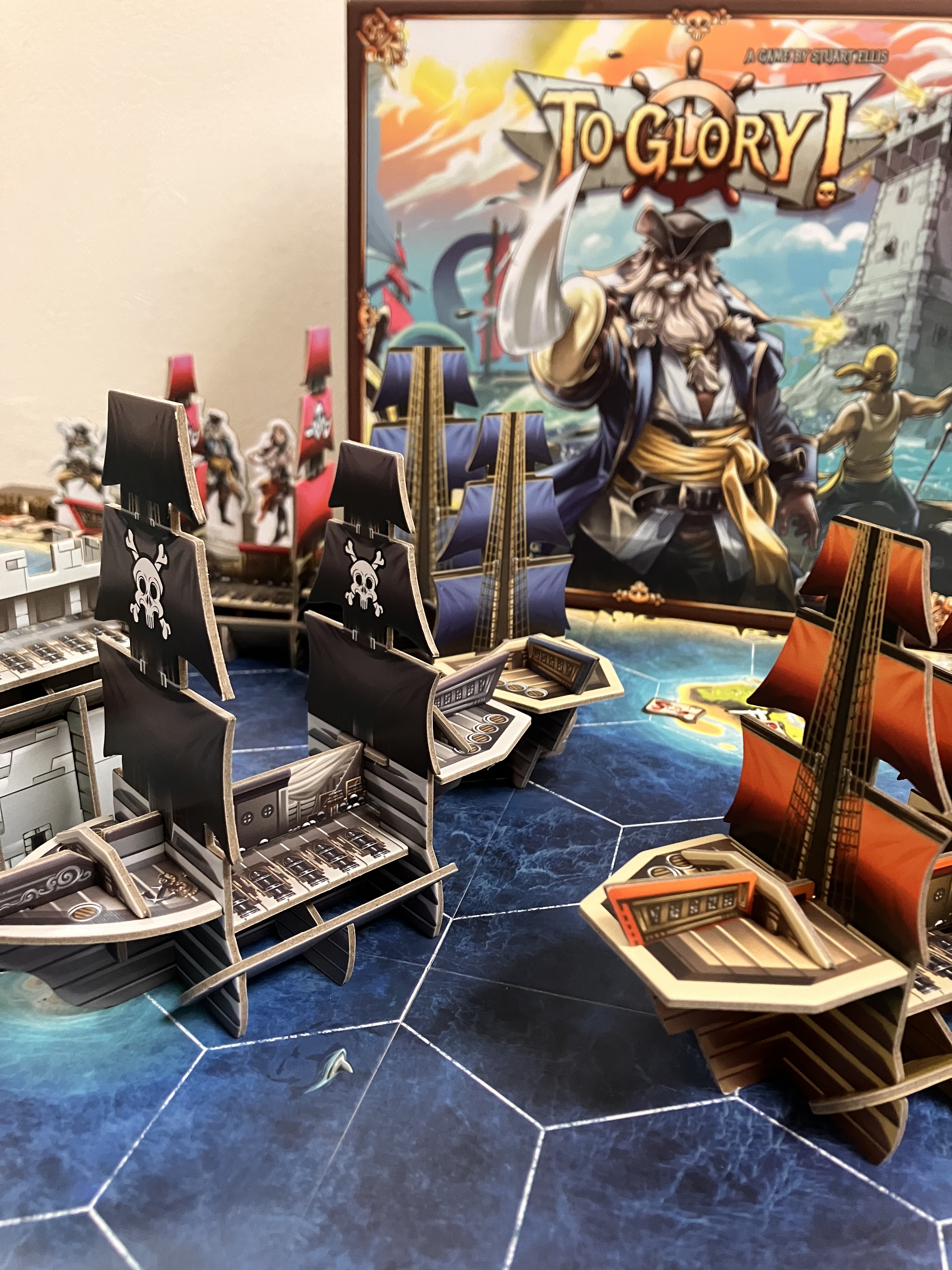 「To Glory!」は各プレイヤーが海賊船の船長となり島々にある宝の地図や宝箱の獲得を目指します。