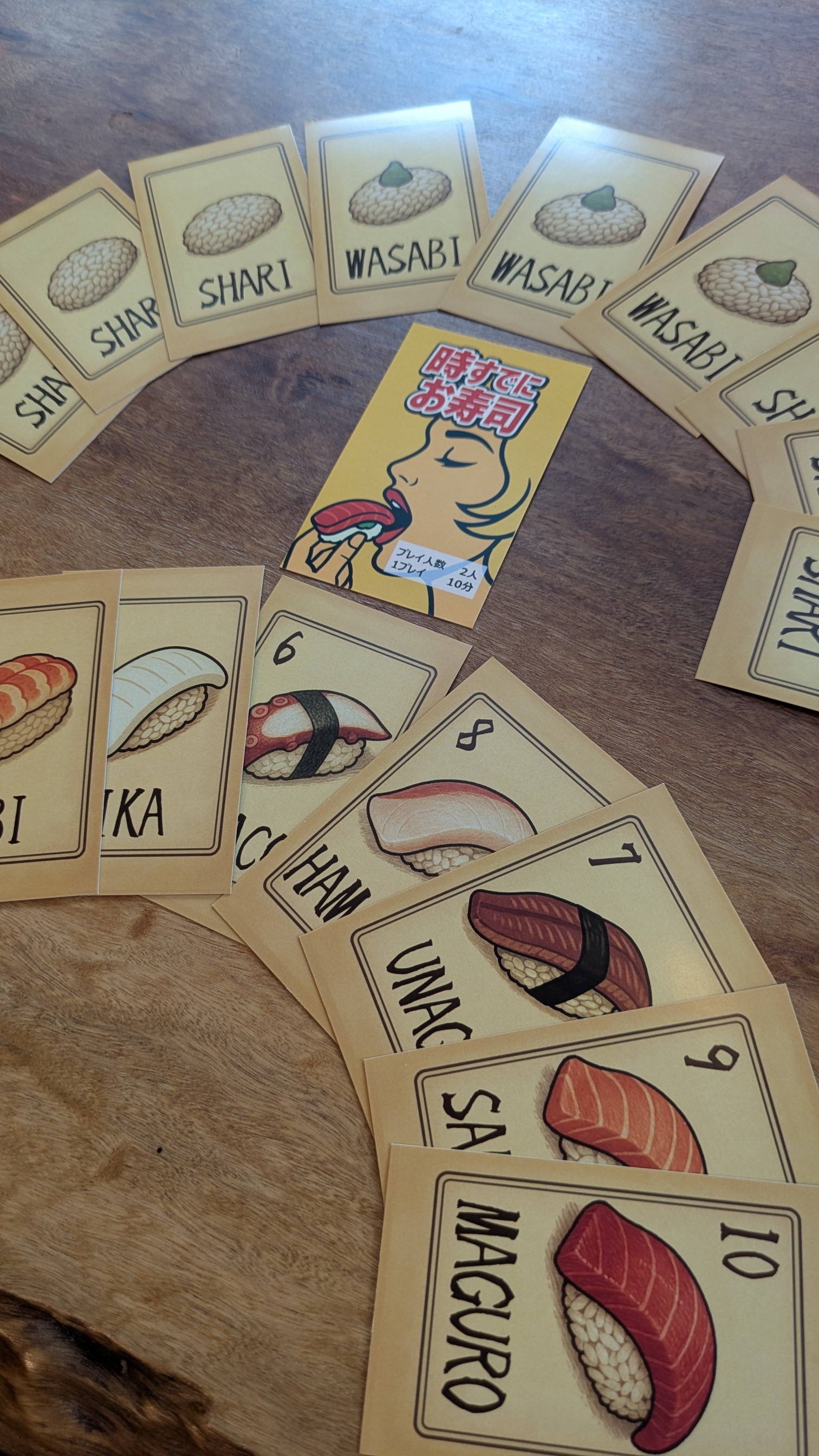 大将は数字の書かれた寿司カードと一緒にシャリ(寿司の数字がそのまま得点になるカード)かワサビ(寿司の数字がマイナスになるカード)のどちらかを伏せて出し、お客は食べるかパスするかを選べます(パスは3回迄)