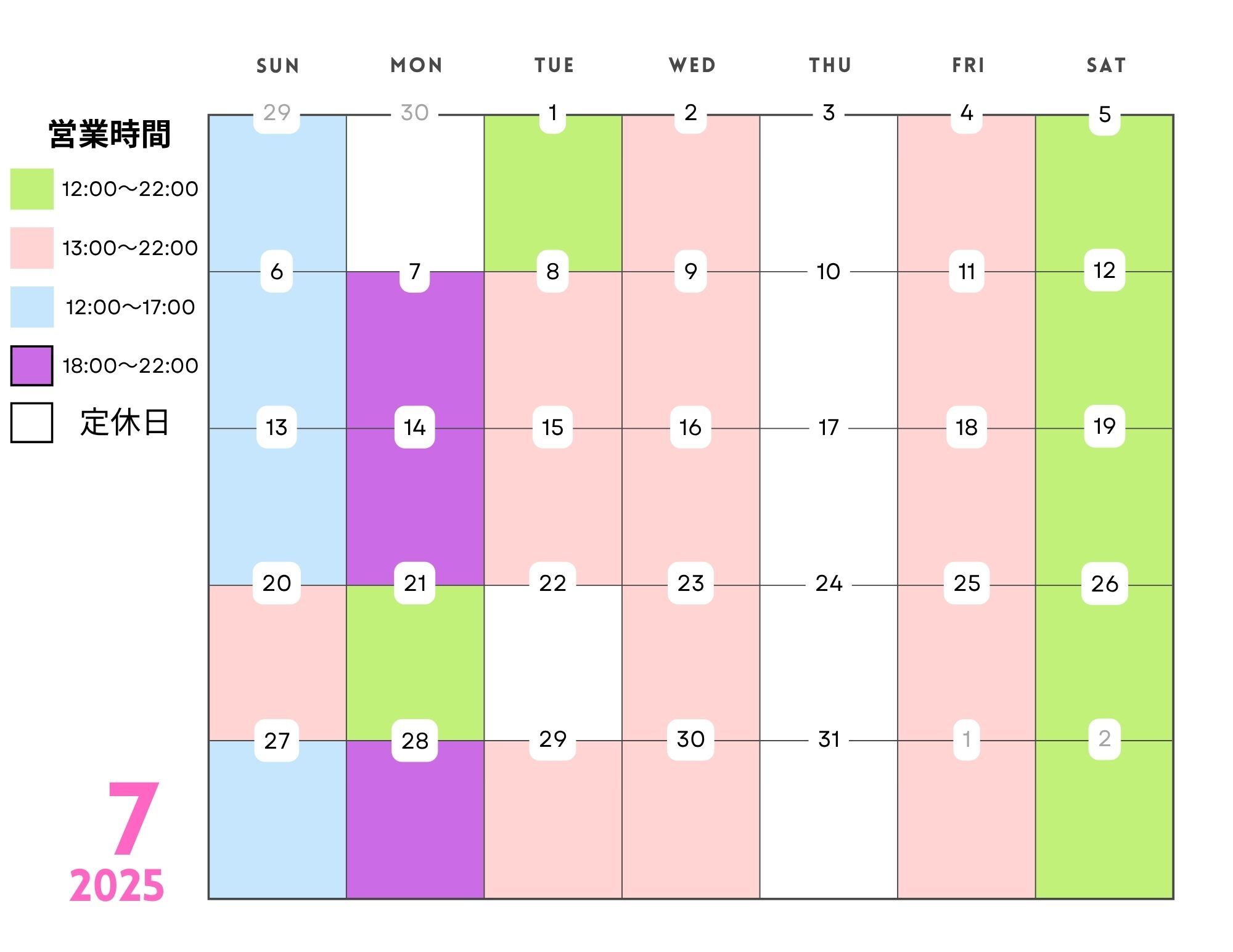 下記、7月の営業日カレンダーです。