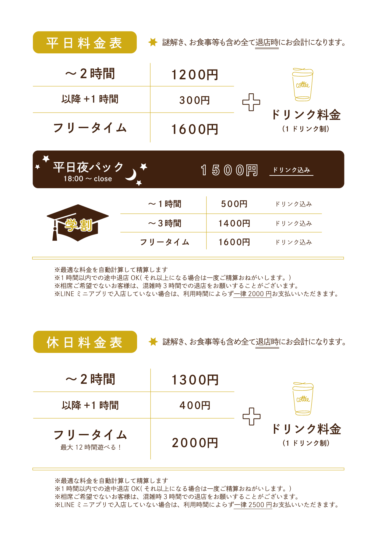 | 料金レンジ | 2時間 1,200円~休日フリータイム2,000円 |