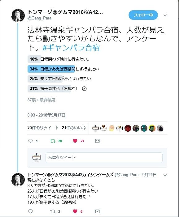 ギャンパラ制作者がなんと「法林寺温泉ギャンパラ合宿」実現に向けてtwitterでアンケートを取ってくれています。