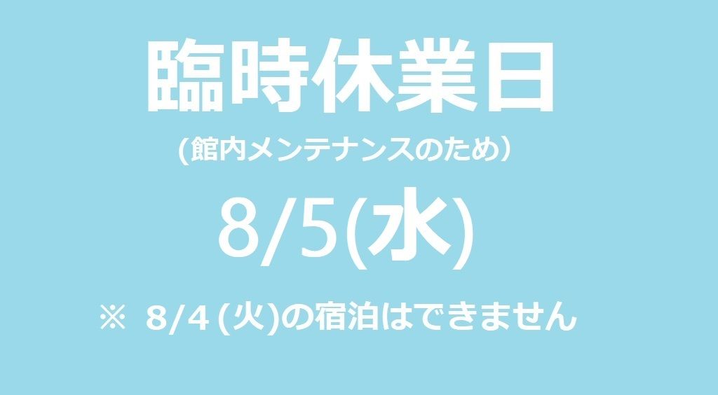 - 2年以上前2023年06月22日 07時48分頃2023年度夏 臨時休館日のおしらせ【臨時休館日のおしらせ】館内メンテナンスのため7/19-20の日程にて臨時休館いたします。みなさまにはご迷惑をおかけしますがご周知のほどよろしくお願いします。例年はメンテナンス作業に1日のみ休んでいましたが、今年は2日間休むことになっております。十分お気をつけください。【2023年度夏臨時休館...39ページビュー