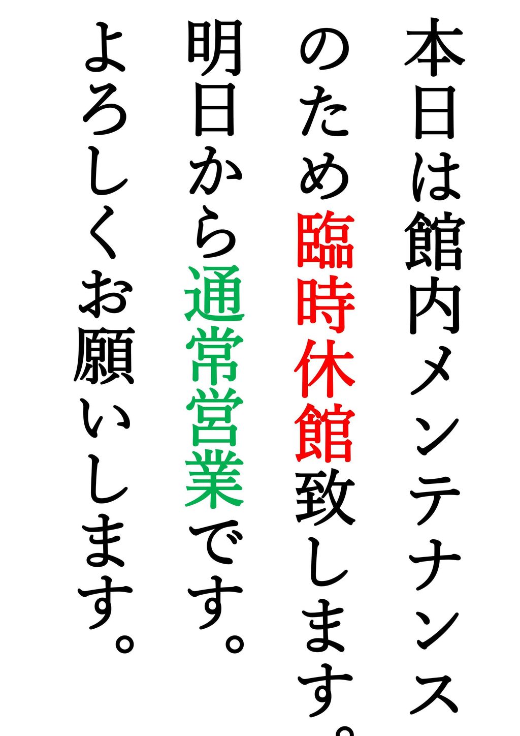 - 2年以上前2023年06月22日 07時48分頃2023年度夏 臨時休館日のおしらせ【臨時休館日のおしらせ】館内メンテナンスのため7/19-20の日程にて臨時休館いたします。みなさまにはご迷惑をおかけしますがご周知のほどよろしくお願いします。例年はメンテナンス作業に1日のみ休んでいましたが、今年は2日間休むことになっております。十分お気をつけください。【2023年度夏臨時休館...39ページビュー
