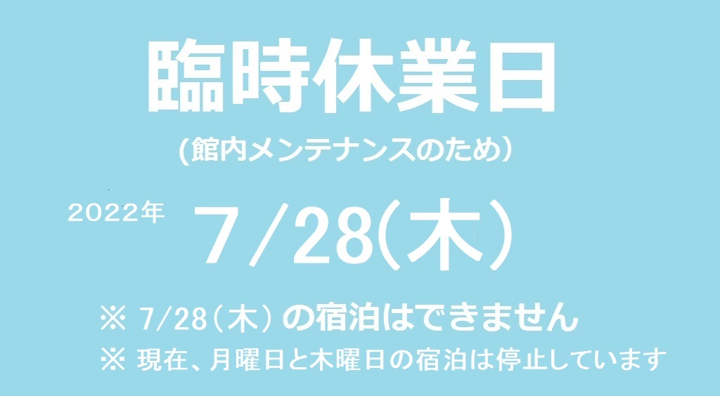 - 6ヶ月前2025年06月23日 08時12分頃臨時休業のお知らせ(7/7 - 7/12)【臨時休業のお知らせ】館内メンテナンスのため下記期間お休みさせていただきます。7/7(月) -7/12(土)6日間に渡ってお休みさせていただきます。また6/11より7/12までの宿泊も新規受付も停止させていただきます。33ページビュー