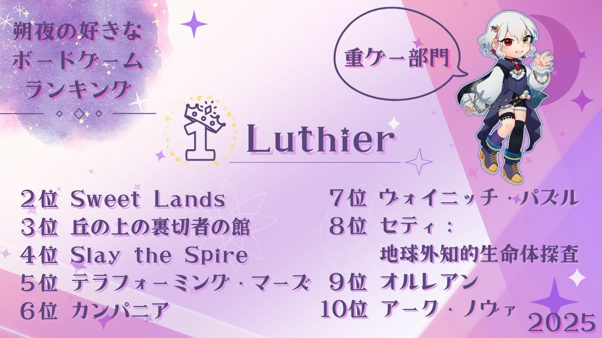 そして最近出た「Luthier」も本当に面白いゲームです!なかなか遊べる環境がまだ珍しいかもしれませんが、日本語版も出たのでもし見かけたら1度は遊んでみてほしいですね!