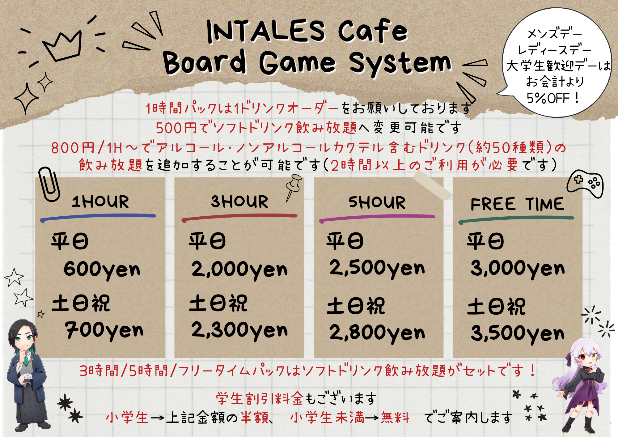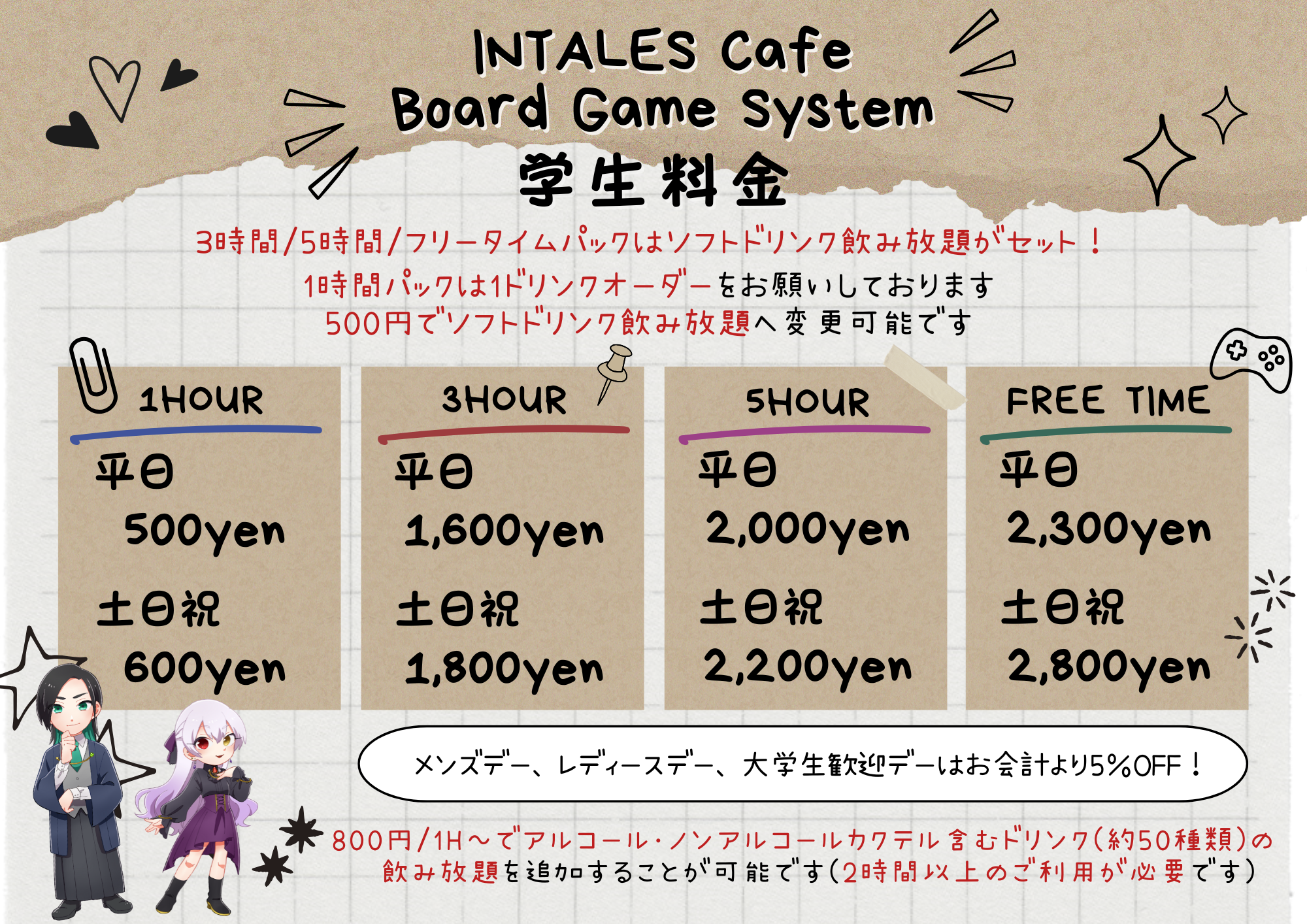 | 備考 | 毎週月曜日のみボードゲームカフェのみの利用となり、15時からの営業開始となります!