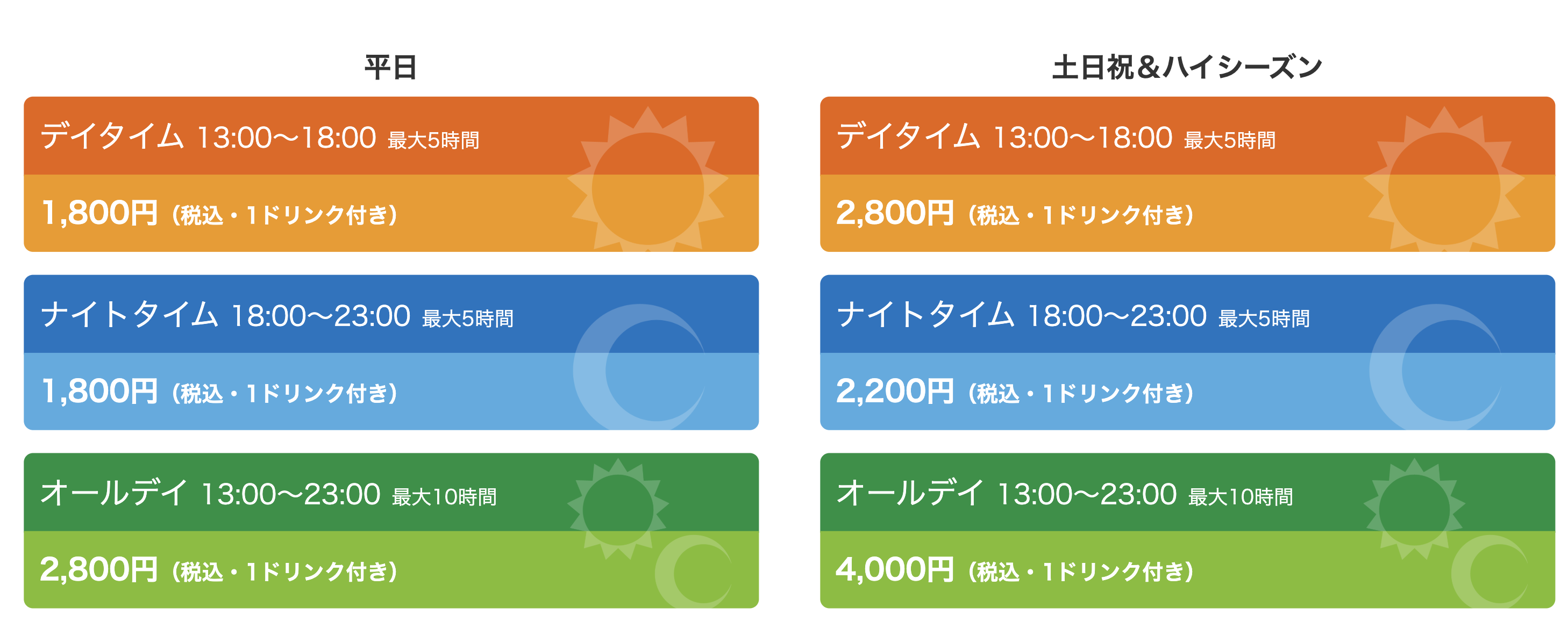 また、小学生の方は、土日祝日&ハイシーズンもデイタイム・ナイトタイムそれぞれ1500円でご利用いただけます。