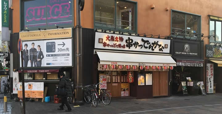 右手に「串かつでんがな」が見えたらそこを右へ曲がる