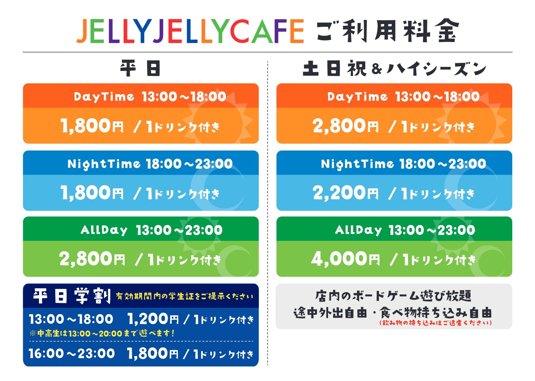 ・大学生は13:00~18:00(デイタイム)のご利用料金、おひとり様あたり 1,200円(1ドリンク付き)