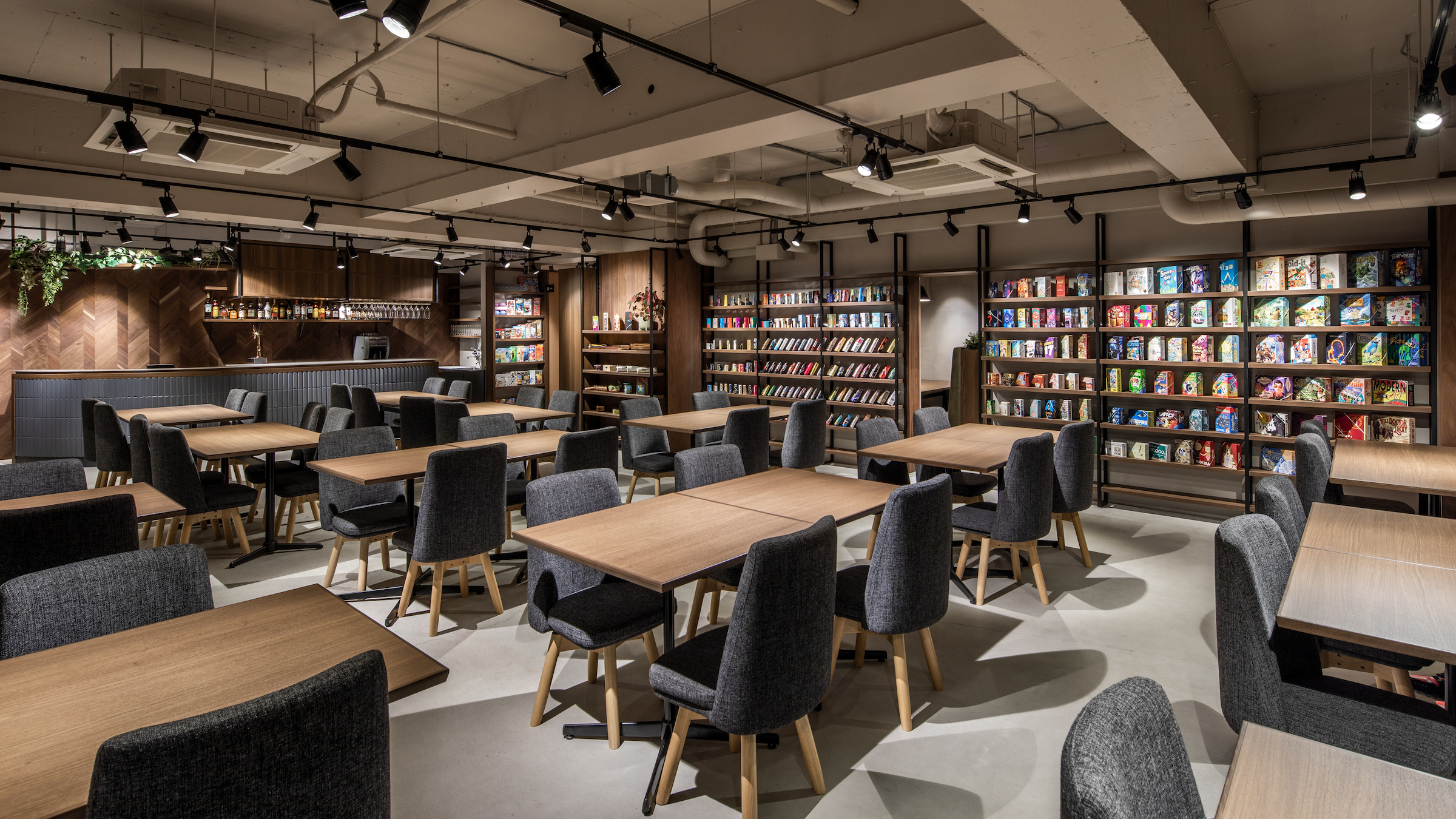 四方を棚に囲まれたボードゲームライブラリや、個室のボックス席など独自性溢れる店内の作りも見どころです。