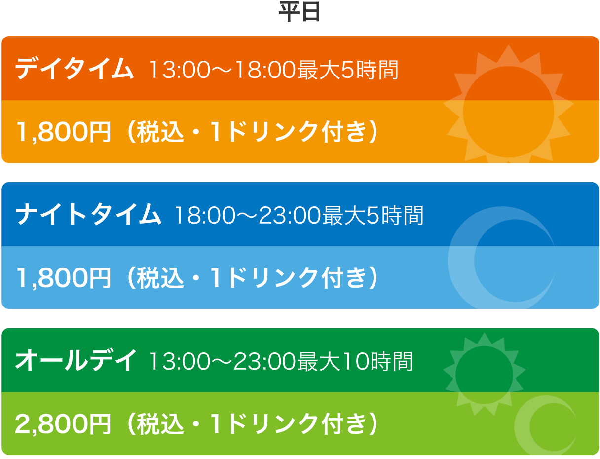 ※ 18時以降は、延長料金1,000円(土日祝&ハイシーズンはプラス1,200円)で閉店までご利用いただけます。