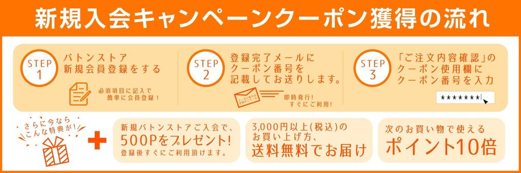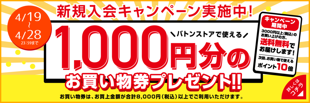 今だけ!新規会員登録でバトンストアで使えるお買い物券1,000円分をプレゼント!!!