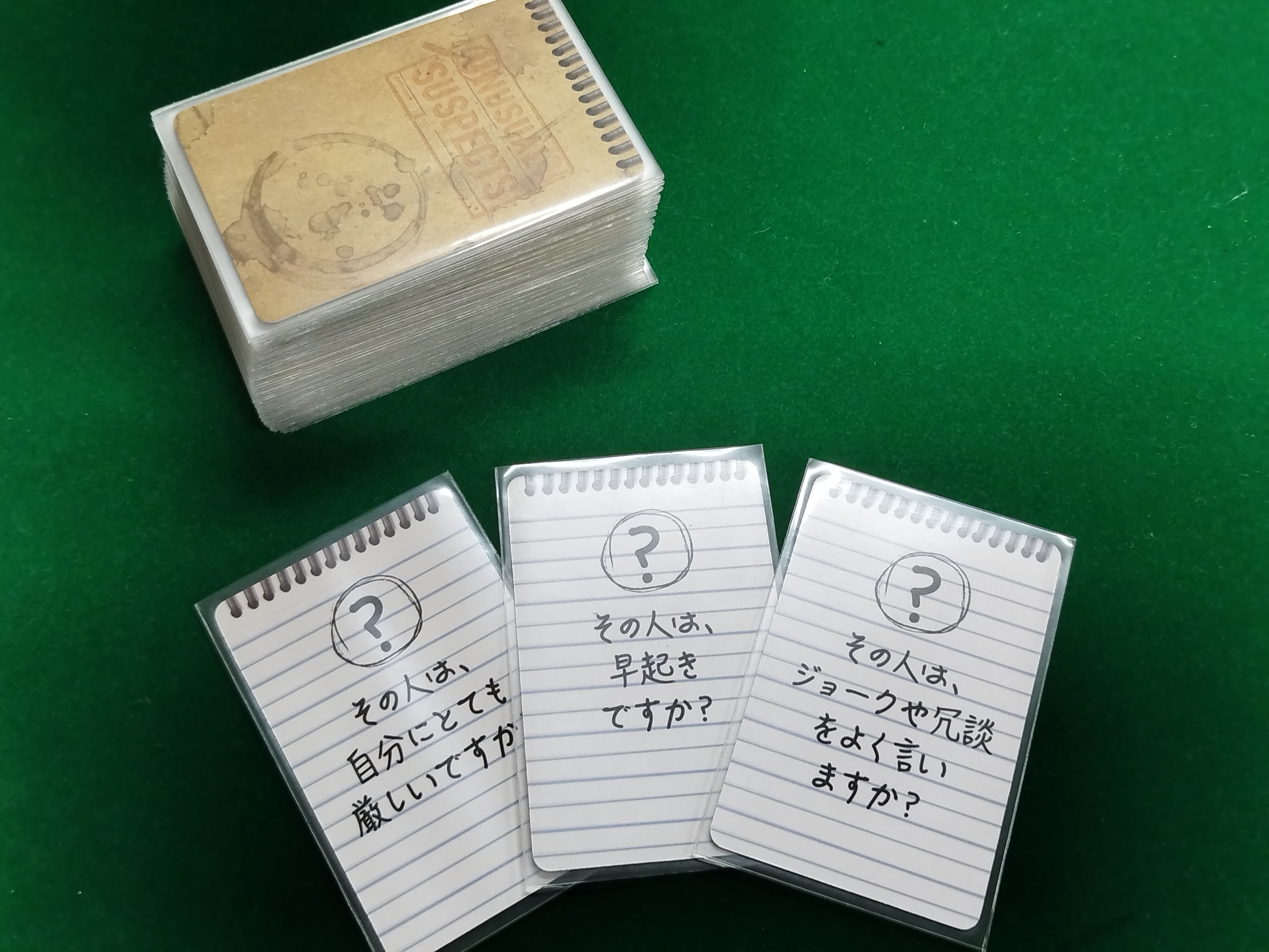 刑事側は質問カードの山札から1枚引いて目撃者に質問します。