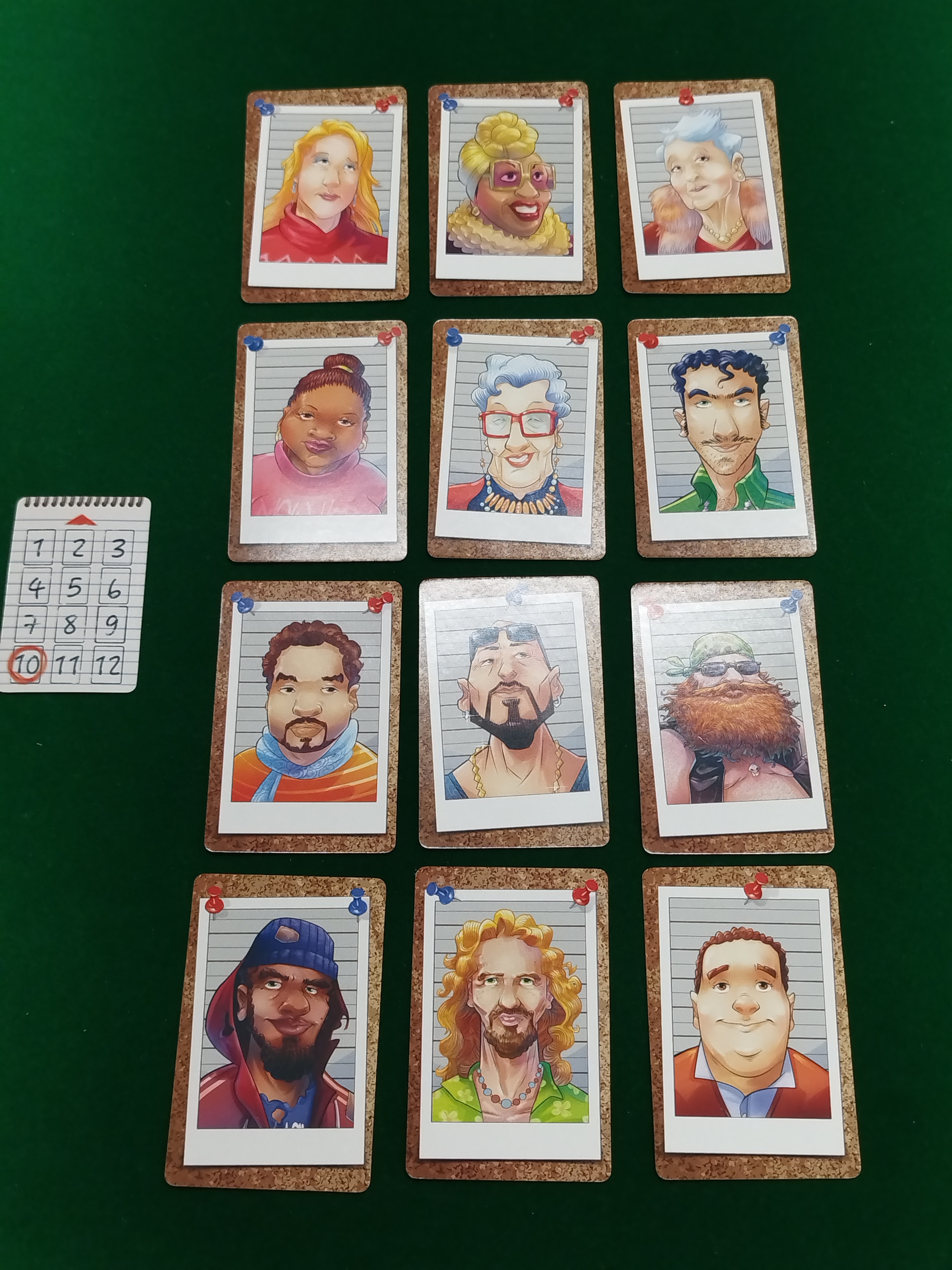 目撃者が決まったら容疑者を12人並べ、目撃者は犯人カードを確認します。