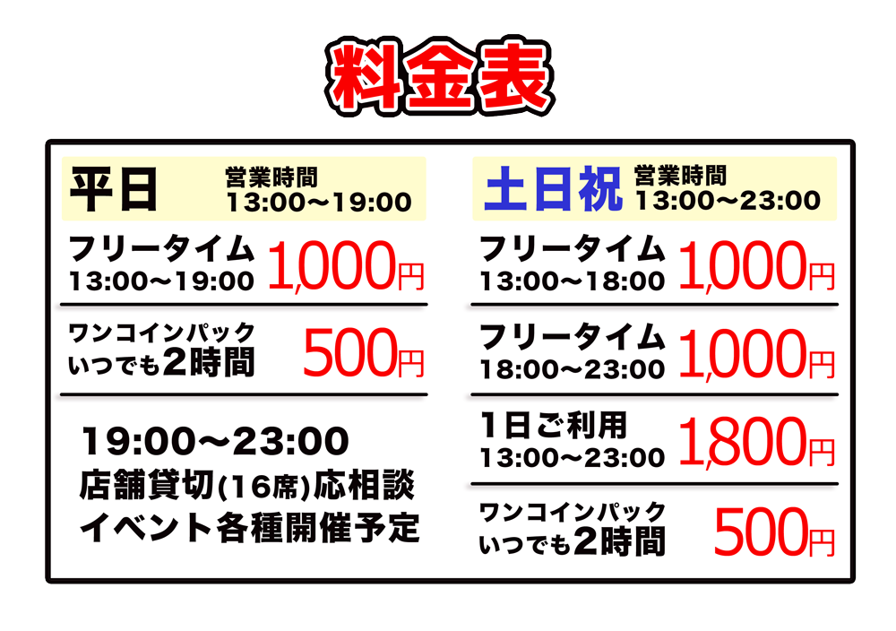 - 6年弱前2020年01月31日 22時31分頃2020年2月より平日の営業時間とフリータイム料金が変更となりました埼玉県越谷市にありますボードゲームプレイスペースZESTです。2020年2月より平日の営業時間変更に伴いフリータイム料金が以下の通り変更となりました。19時以降はイベントや貸切で営業をさせていただきます。引き続きよろしくお願い申し上げます。1411ページビュー
