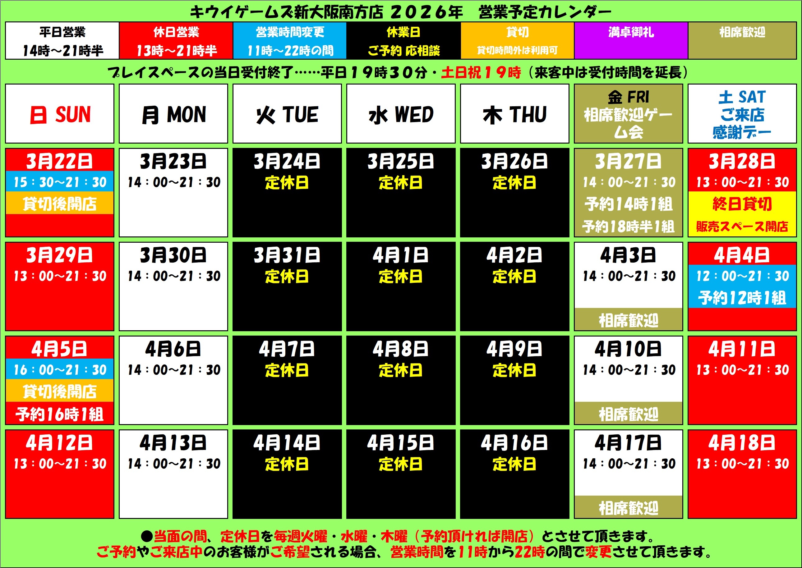 ・本日は14時から21時30分まで、相席歓迎フリーゲーム会「イタメシ会」も開催の平日営業で開店させて頂きます。