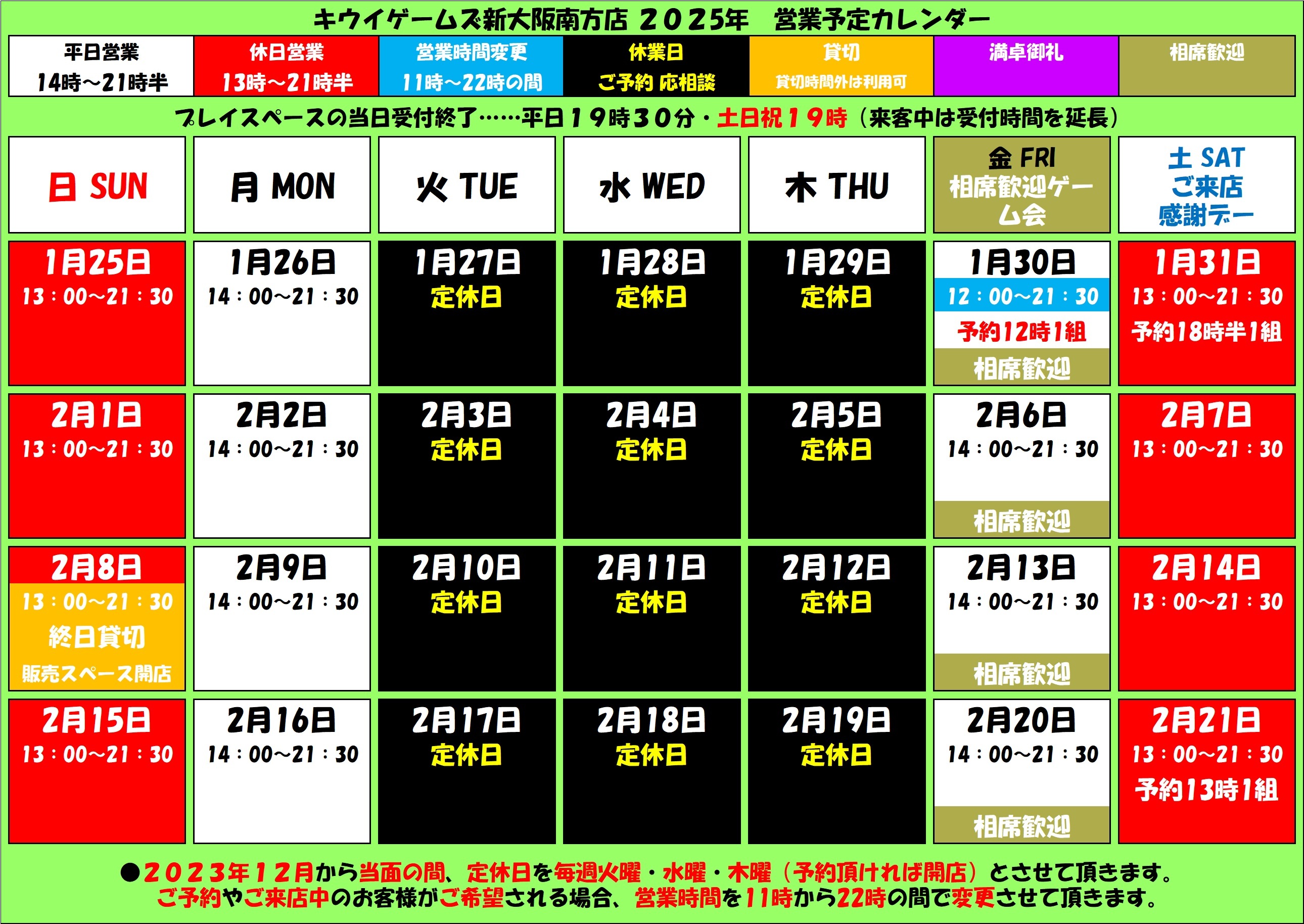 - 7ヶ月前2025年06月30日 11時04分頃【2026年2月2日(月)14時00分】21時30分(受付終了19時)まで平日営業で開店させて頂きます。お席に余裕がございます。お気軽にご予約ご来店下さいませ。再度の緊急事態宣言や自粛要請、ご予約やご来店中のお客様のご希望により、営業時間の変更や臨時休業の可能性がございます。今後の営業情報にご注意ください。JR新大阪駅・徒歩3分。お得な学割半額、TRPGでのご利用も。お気軽にご予約ご来店下さいませ☆ #ボードゲーム #TRPGこんにちわー☆14時00分、21時30分(受付終了19時)まで、平日営業で開店させて頂きます。お席に余裕がございます。お気軽にご予約ご来店下さいませ。再度の緊急事態宣言や自粛要請、ご予約やご来店中のお客様のご希望により、11時から22時までの営業時間の変更や臨時休業の可能性がございます。今後の...137ページビュー