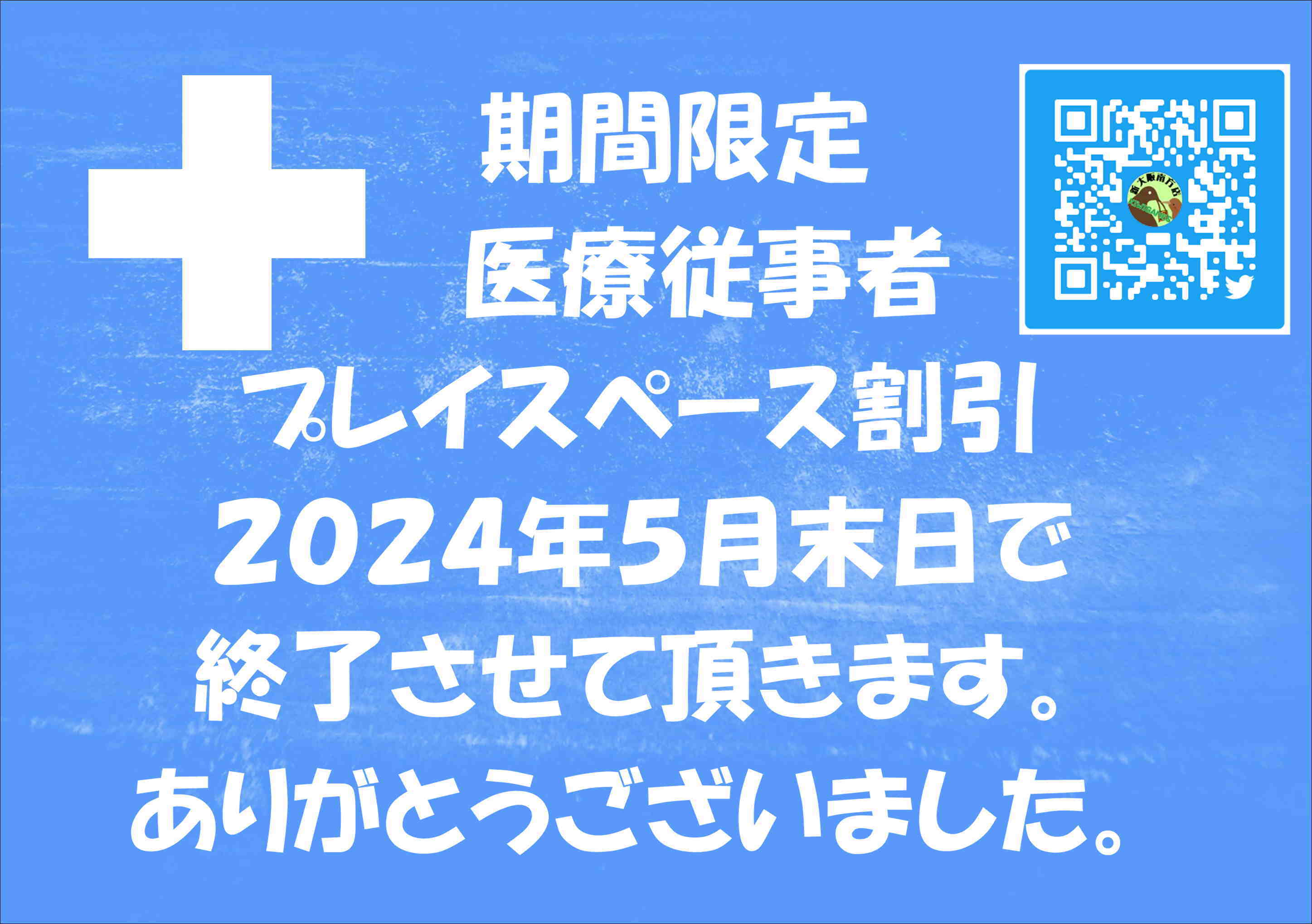 政府が定める医療従事者の身分証(保険証・医療機関所属を証明する書類など)をご提示頂きましたお客様は、プレイスペースを割引半額でご利用頂いておりました。これまでのご利用、厚くお礼申し上げます。