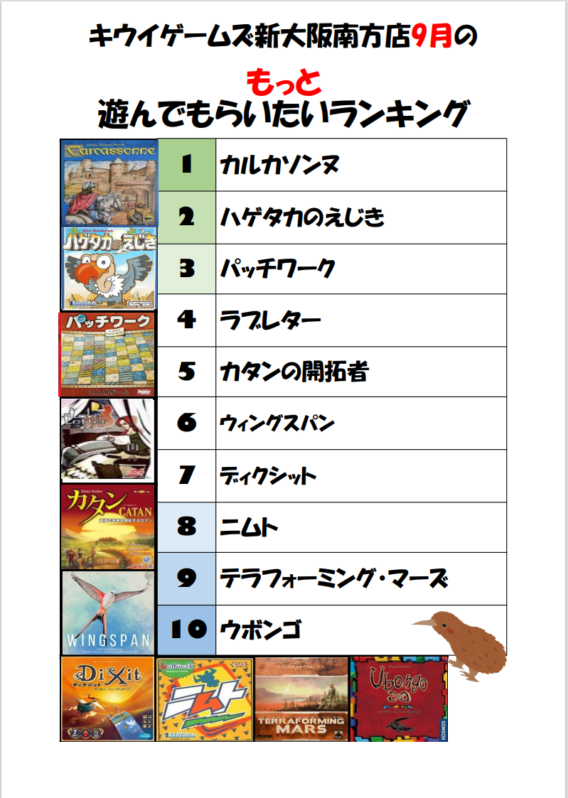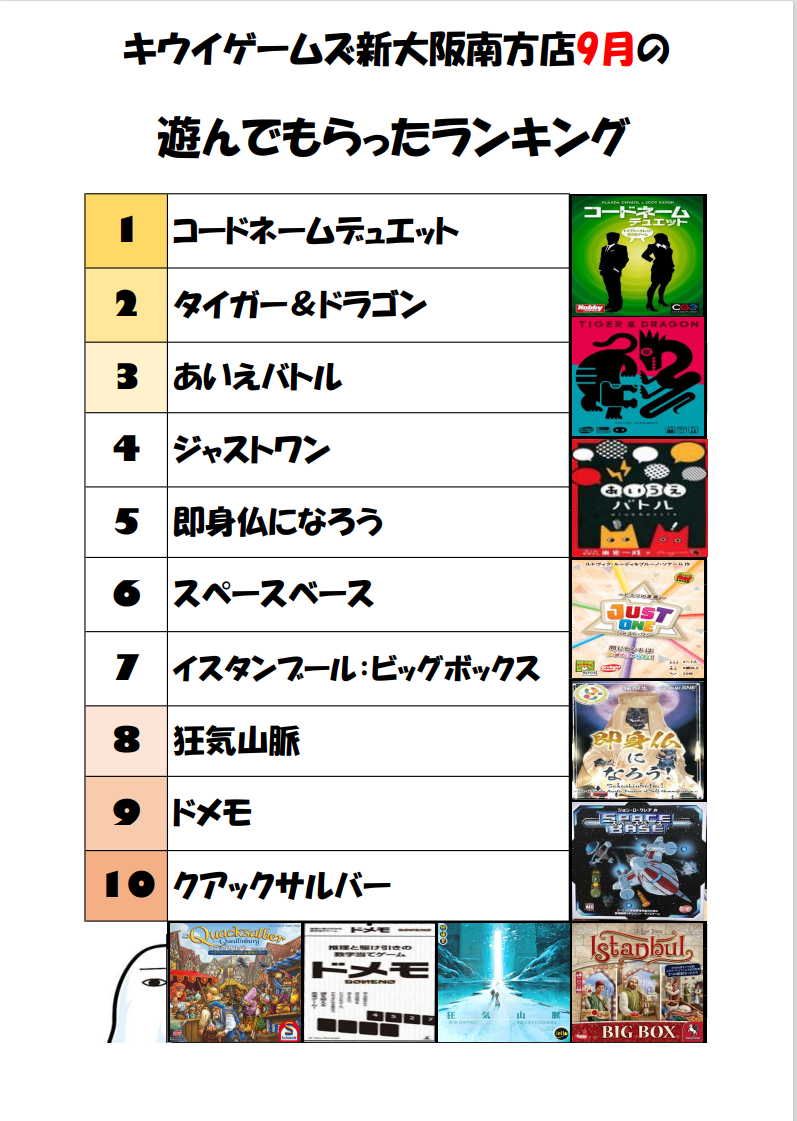 - 約1年前2024年09月20日 21時26分頃【ゲームランキング!】【当店のプレイスペース・ゲームランキング!】●2025年9月、遊んでもらったゲームランキングです!①コードネームデュエット②タイガー&ドラゴン③あいうえバトル④ジャストワン⑤即身仏になろう!⑥スペースベース⑦イスタンブール:ビッグボックス⑧狂気山脈⑨ドメモ⑩クアックサルバー●2025年9月もっ...796ページビュー