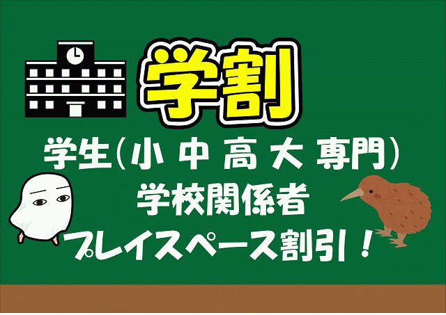 - 1年以上前2024年08月05日 19時22分頃【学割あります!】学生(小・中・高・大・専門)。学校関係者の方。入会時、更新時に学生証・身分証をご提示頂くと、プレイスペース料金が4割引です!お気軽にご利用下さい!76ページビュー