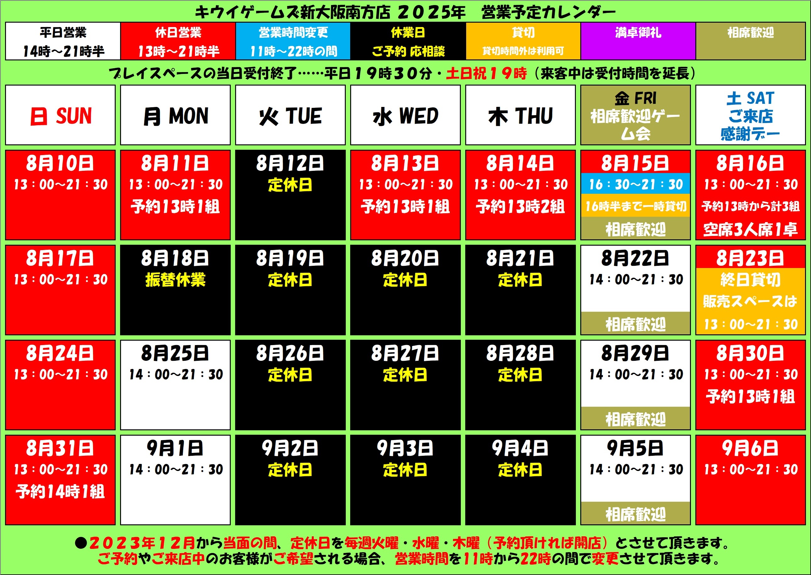 - 4ヶ月前2025年08月16日 19時14分頃【2025年8月18日(月)臨時休業】本日は所要により臨時休業させて頂きます。明日(火)から明々後日(木)は定休日です。金曜14時から21時30分まで相席歓迎フリーゲーム会「イタメシ会」も開催の平日営業で開店させて頂きます。お席に余裕がございます。お気軽にご予約ご来店下さいませ。なお再度の緊急事態宣言や自粛要請、ご予約やご来店中のお客様のご希望により、営業時間の変更や臨時休業させて頂く場合がございます。営業時間の変更にご注意下さい。JR新大阪駅から徒歩3分。学生半額割引、TRPGでのご利用も気軽に! #西中島南方 #新大阪 #ボードゲーム #TRPG・本日は所要につき、臨時休業させて頂きます。明日(火)から明々後日(木)まで定休日です。金曜14時から21時30分まで、相席歓迎フリーゲーム会「イタメシ会」も開催の平日営業で開店させて頂きます。お席に余裕がございます。お気軽にご予約ご来店下さいませ。なおご予約やご来店中のお客様のご希望により、...41ページビュー
