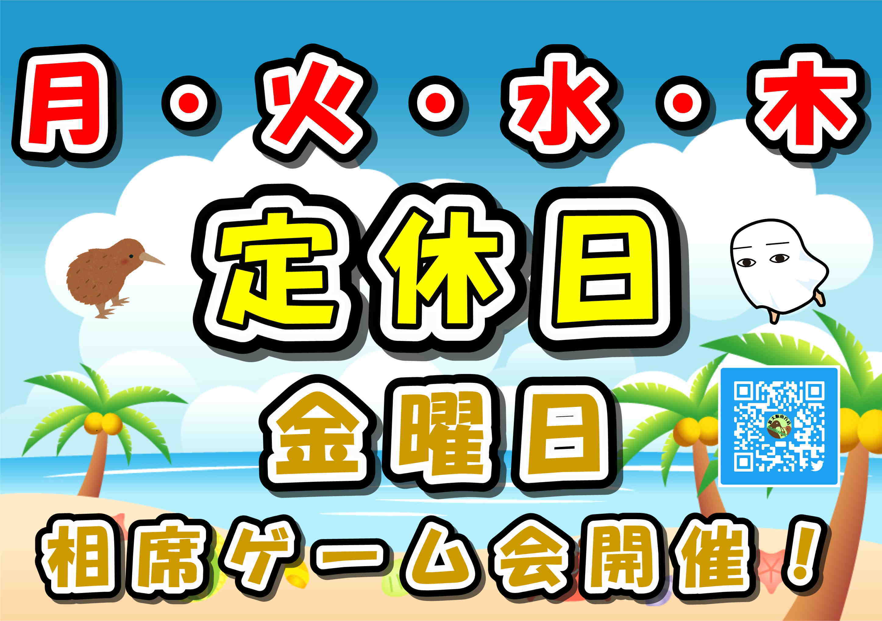 営業情報は、当店ホームページ( http://kiwigames-som.jp/ )や当店ツィッターアカウント( https://twitter.com/kiwigames_som )にて、ご案内させて頂きます。