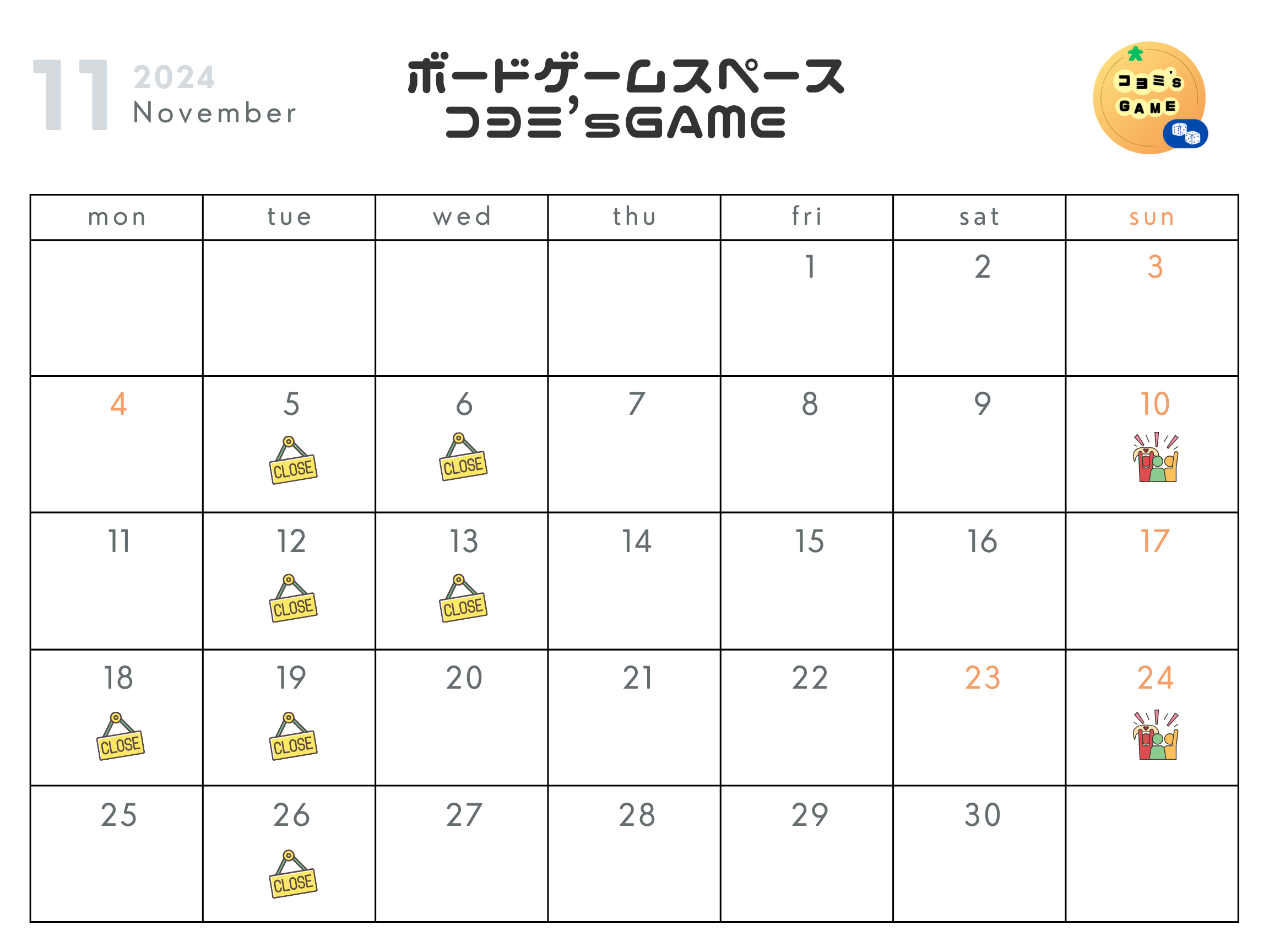 - 17日前2025年11月19日 09時39分頃閉店のお知らせ2025年12月14日をもちまして、ボードゲームスペースコヨミ'sGAMEを閉店いたします。応援いただいた方々にはお礼申し上げます。ありがとうございました。予定では12/14までオープンするつもりですので、短い間ですが是非遊びにきてください!64ページビュー
