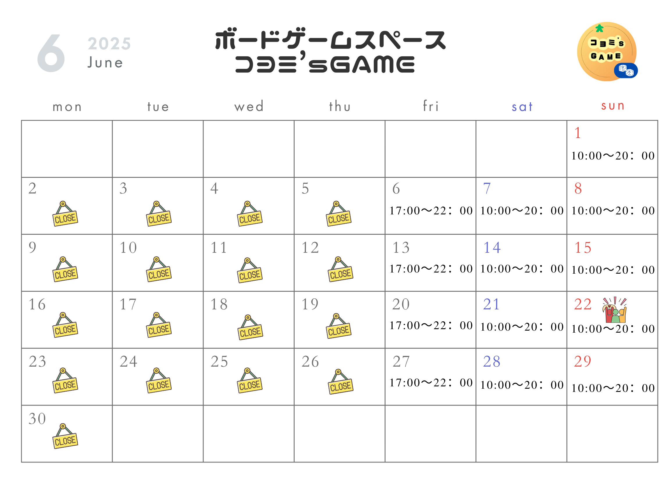 6月の営業日カレンダー(予定)