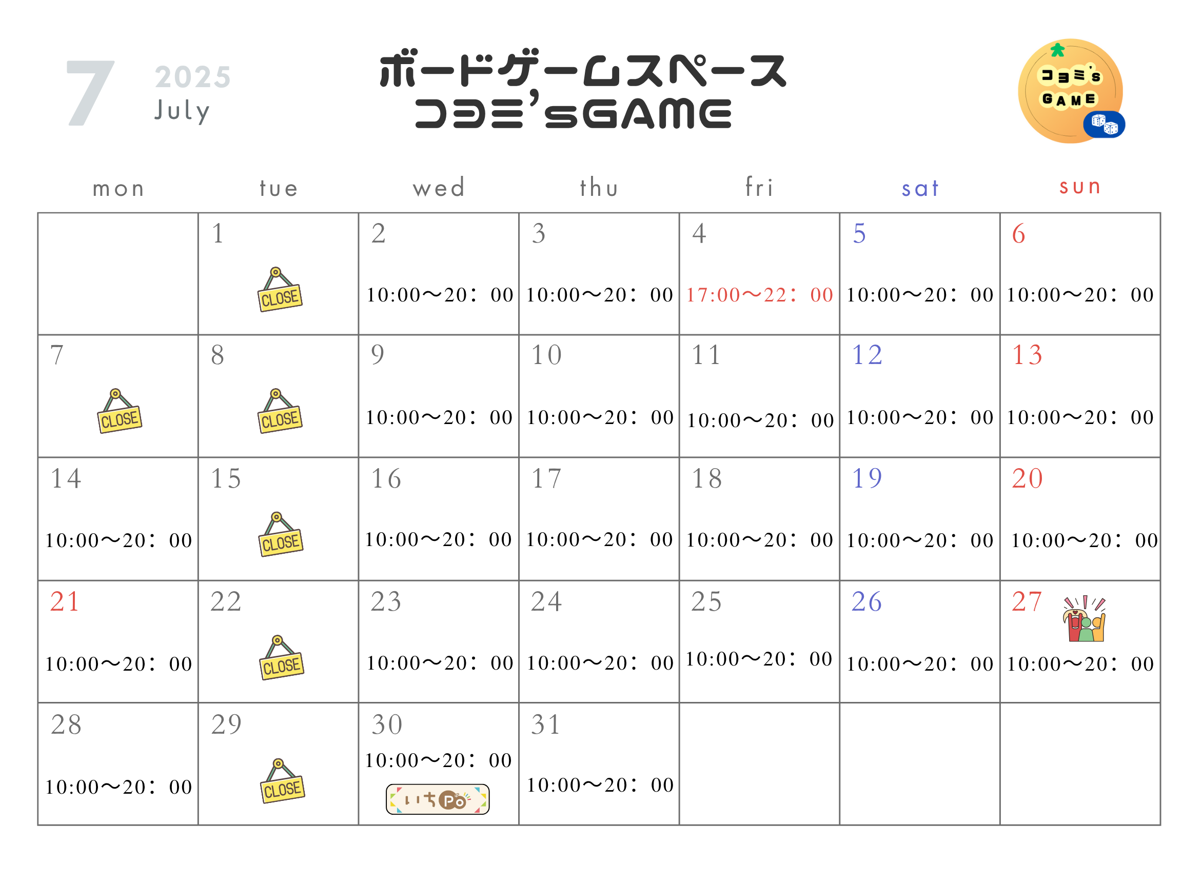 - 17日前2025年11月19日 09時39分頃閉店のお知らせ2025年12月14日をもちまして、ボードゲームスペースコヨミ'sGAMEを閉店いたします。応援いただいた方々にはお礼申し上げます。ありがとうございました。予定では12/14までオープンするつもりですので、短い間ですが是非遊びにきてください!64ページビュー