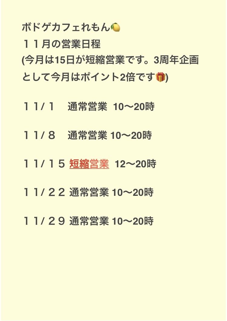 - 約1ヶ月前2025年10月29日 01時38分頃11月の営業日程今月は16日がお昼からの営業となりますのでご注意下さい64ページビュー