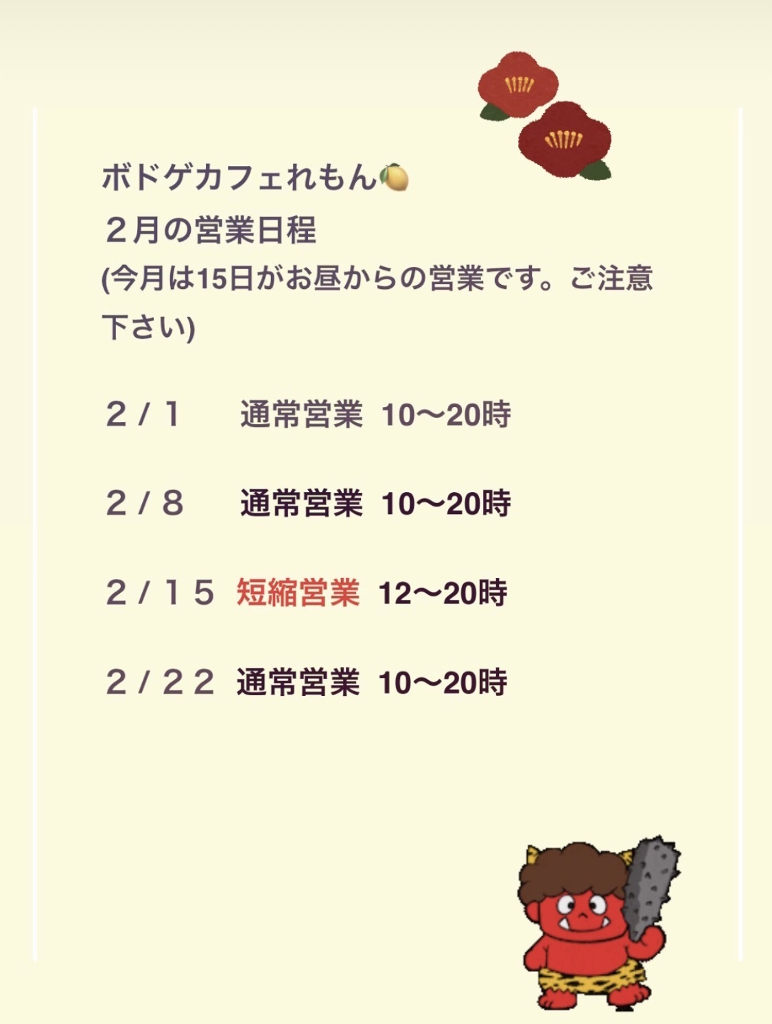 - 3日前2026年02月12日 12時41分頃2月のボドゲ営業日程今月は15日がお昼からの営業になりますのでご注意下さい10ページビュー