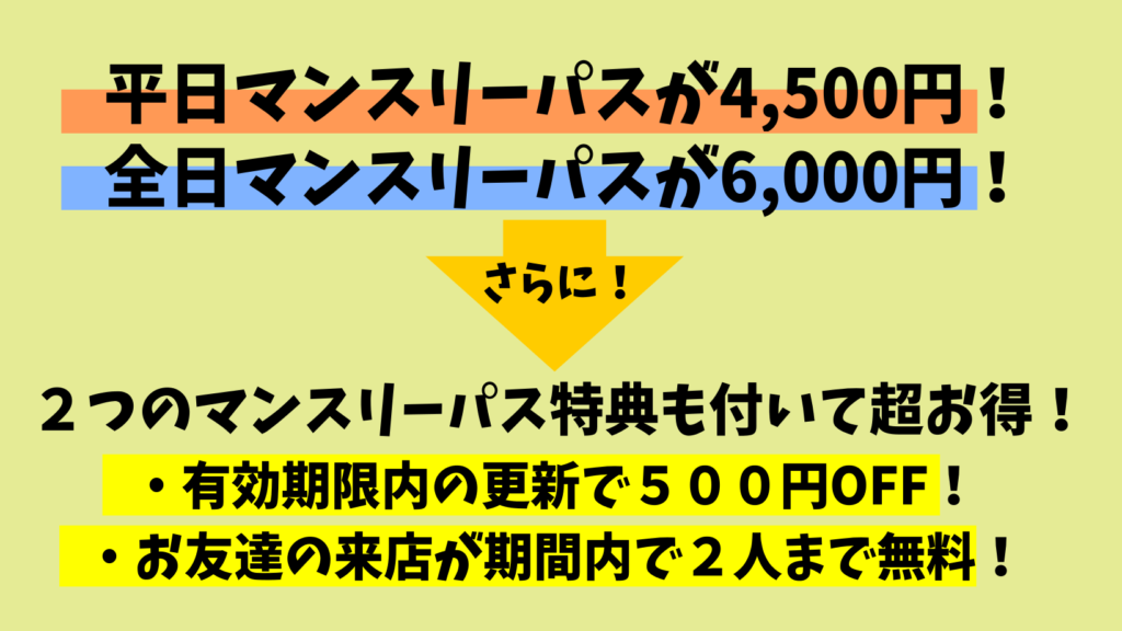 ※ 8月のマンスリーパスを持っている方は、9月中の購入であれば更新とみなし、500円OFFにさせていただきます。