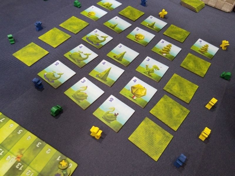 この時同じ絵柄のタイルをみていたならば点数が上昇したり、ゲーム終了時のみ手札3枚も得点化したりできるのですが、まずは見えるトピアリーを見物人駒の前に並べる事が大切です。