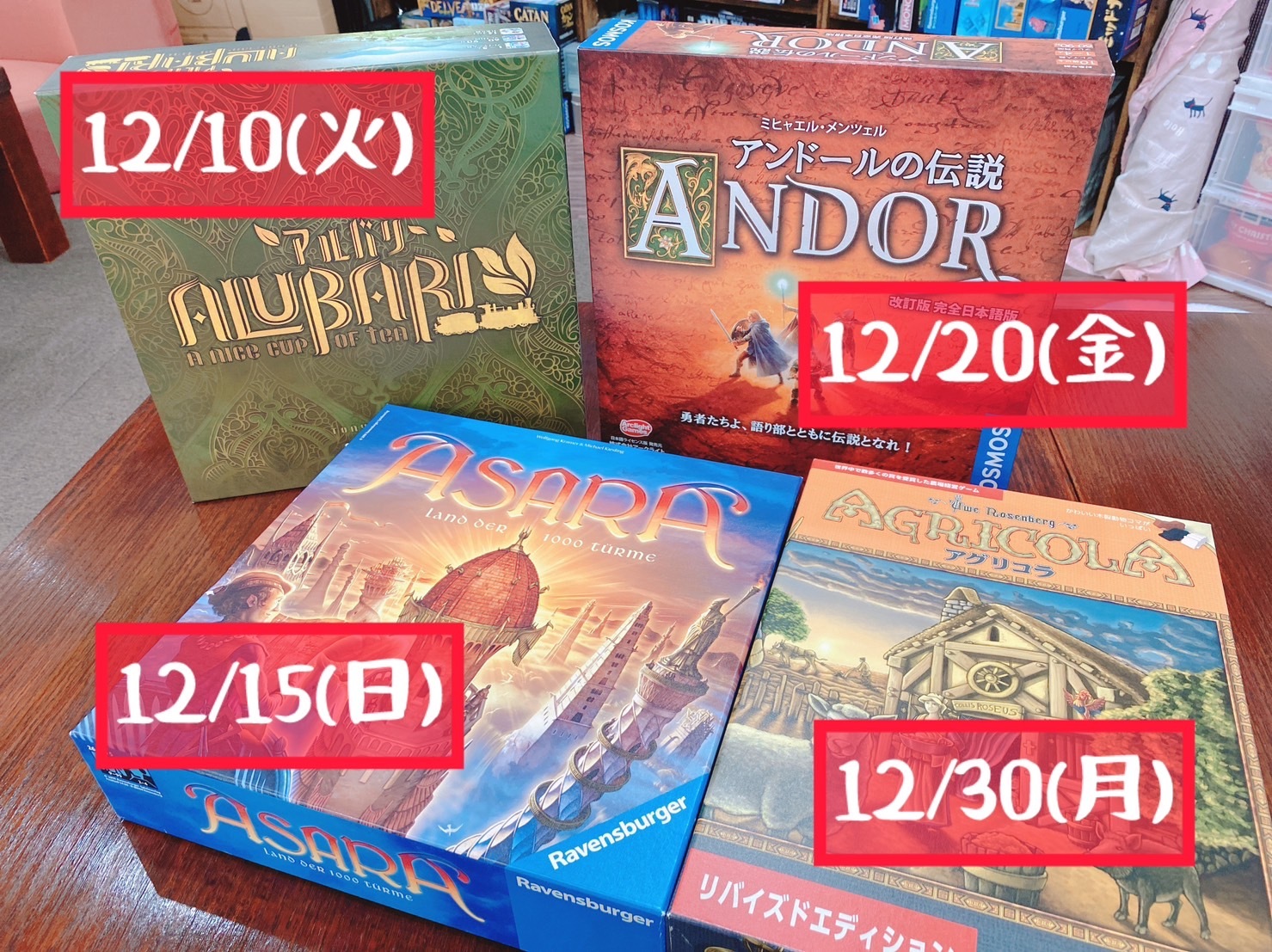 - 約1年前2024年12月03日 18時02分頃12月の「ごとび会(五十日会)」は――12月のごとび会は――。毎月5と0のつく日の夜に「お題ゲーム」を一緒に楽しもうという企画です。(お題ゲームによって料金は変動する予定)12月の予定は以下の通りです。12/10(火)アルバリ12/15(火)アサラ(×2)12/20(日)アンドールの伝説12/30(金)アグリコラ各日19:00スタ...48ページビュー