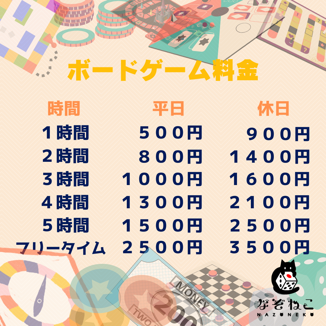 - 3年以上前2022年07月08日 14時11分頃水曜日相席プランなぞねこ相席プランが出来ました!毎週水曜日19時~23時最大4時間1000円1ドリンク付き!水曜日の夜はボドゲで遊びましょう!料金1000円(ボードゲーム料金と300円ドリンク1杯込)途中入退席OK2時間以下の場合は時間料金+ドリンク付(300円以上のドリンクは差額分をお支払いください。)224ページビュー