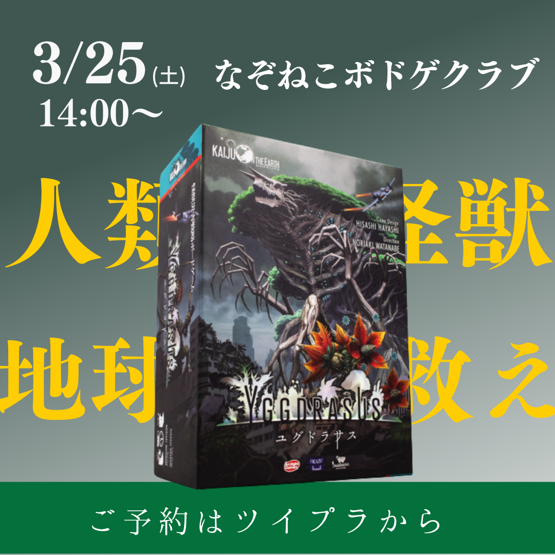 - 2年以上前2023年03月16日 16時17分頃3月25日(土)なぞねこボドゲクラブ開催!『なぞねこボドゲクラブ』とは普段遊ぶ機会の少ないボードゲームを遊ぶ会です。ルール説明はスタッフからさせていただきますので、知らなくても大丈夫!みんなでボードゲームを遊びませんか?ユグドラサスとは?驚異的なスピードで繁殖した植物怪獣『ユグドラサス』世界中に自国の軍隊を派遣し、各地のミッションを解...105ページビュー