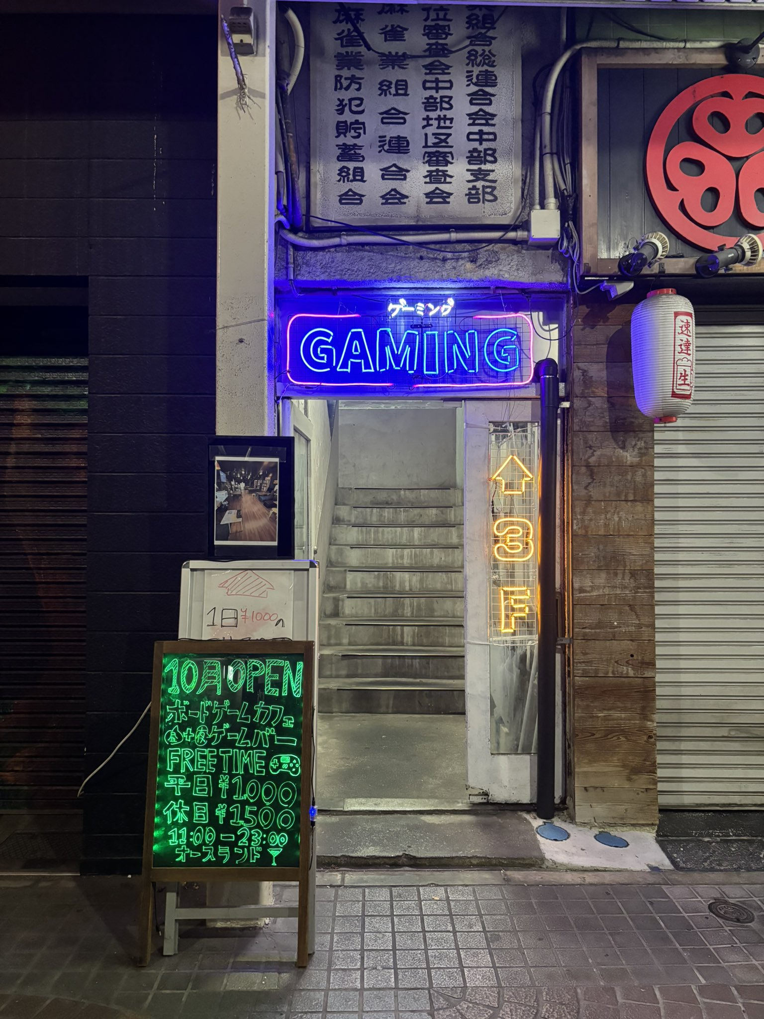 大須交差点を商店街方向に入ってすぐ、大大須ビルヂングの、大須珈琲さんと徳川ホルモンセンターさんの間の階段を上って、3階までお越しください。3階のゲームボーイのような扉を開けて店内にお入りください。